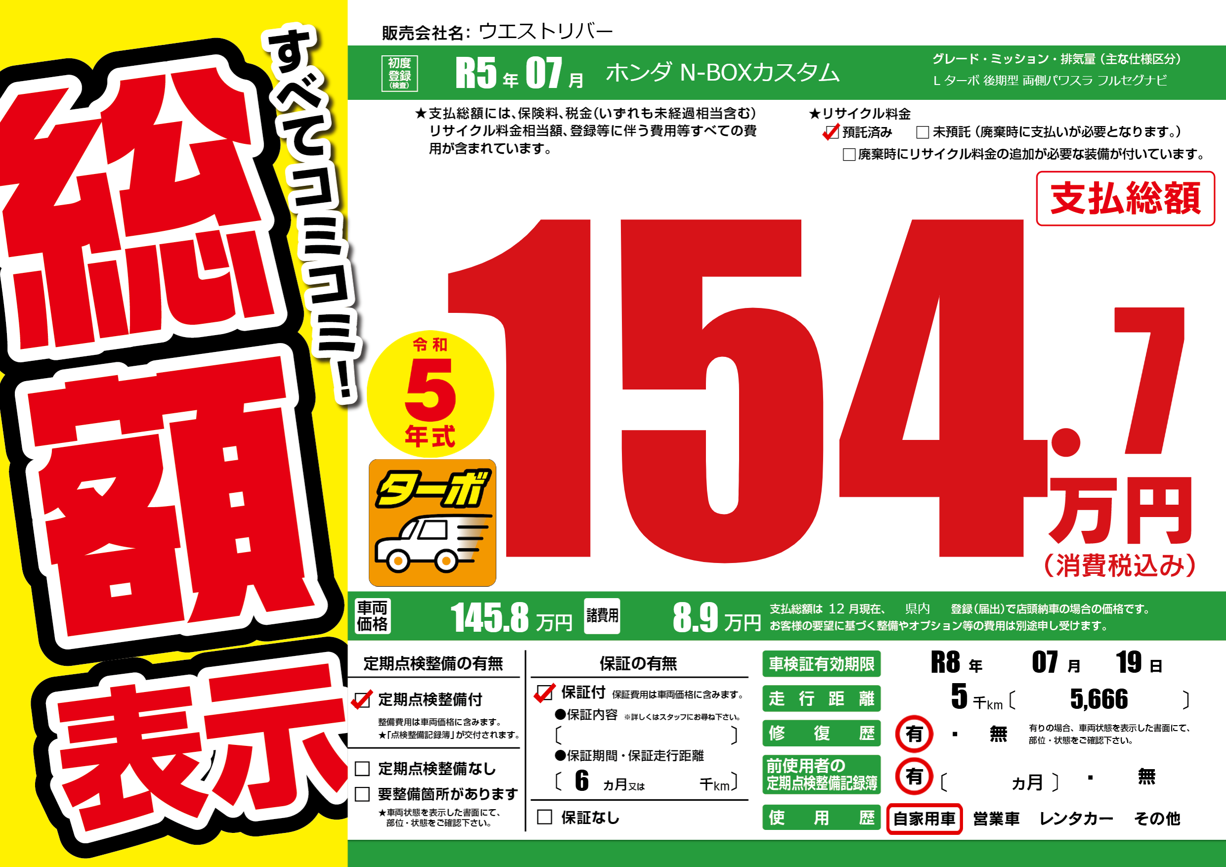 | 走行キロ | 0.5万km | 初年度登録 | R5年07月 |
