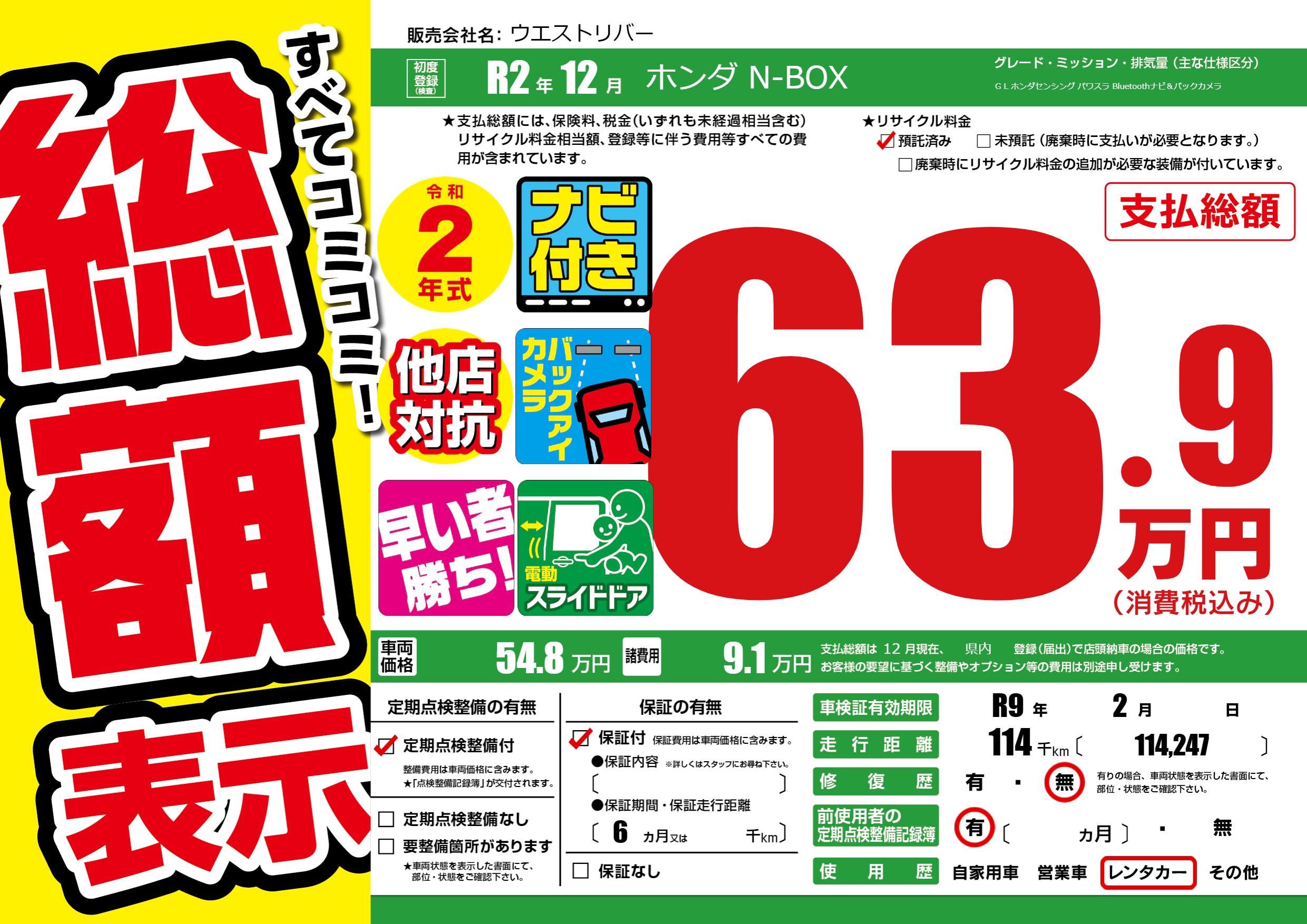 | 車名 | ホンダ N-BOX | グレード ミッション 排気量 |
