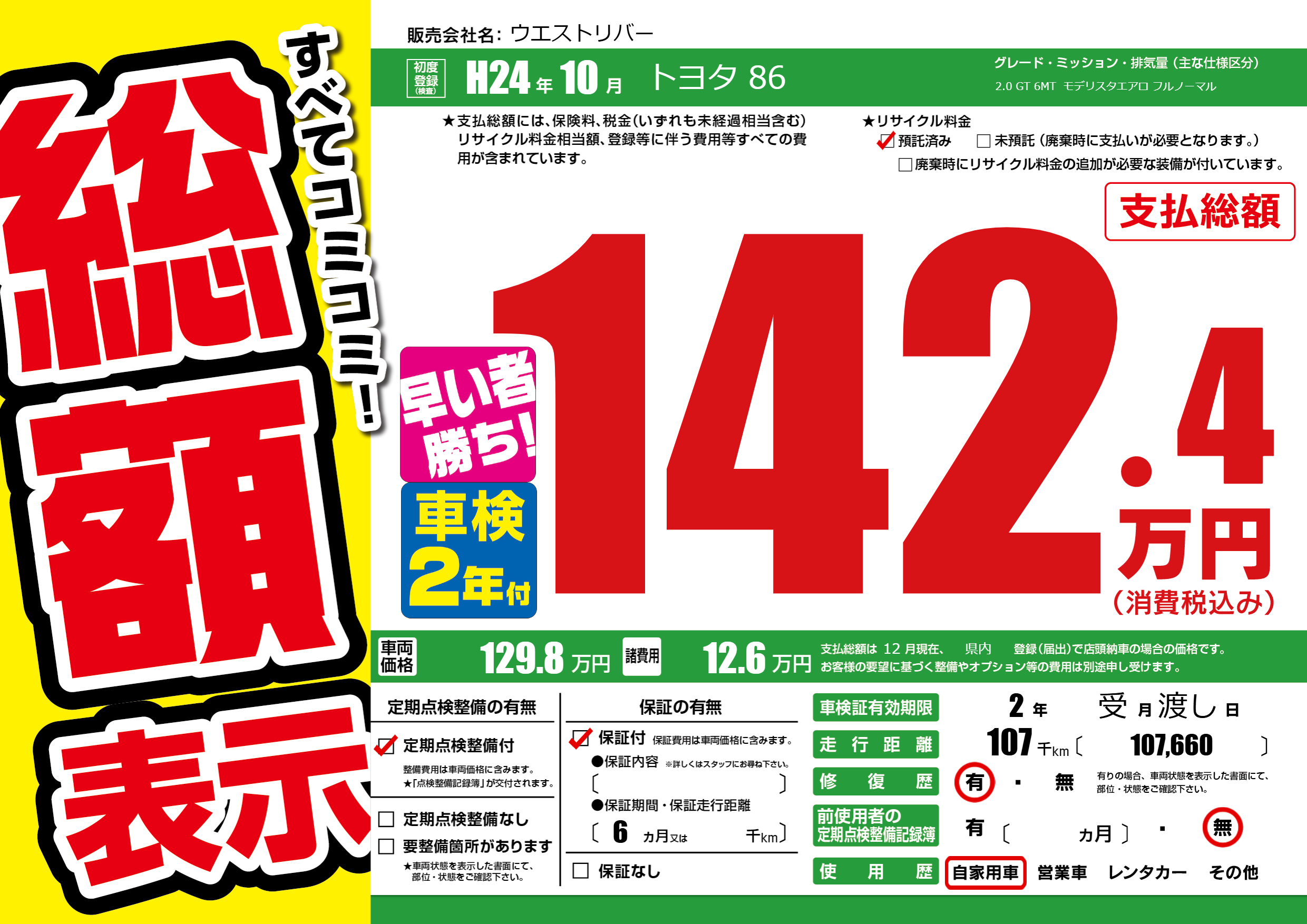 | 走行キロ | 10.7万km | 初年度登録 | H24年10月 |