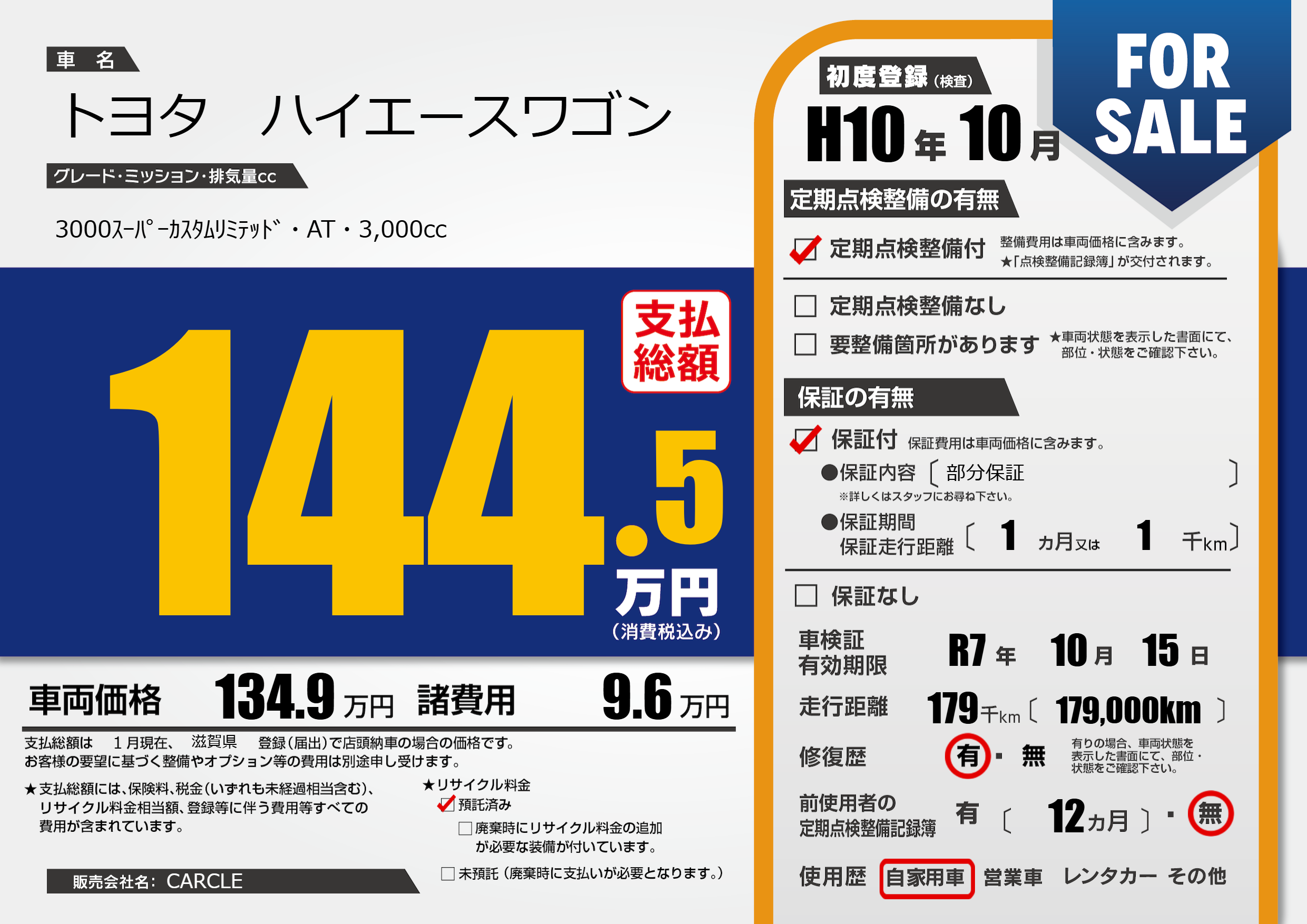 | 走行キロ | 17.9万km | 初年度登録 | H10年10月 |