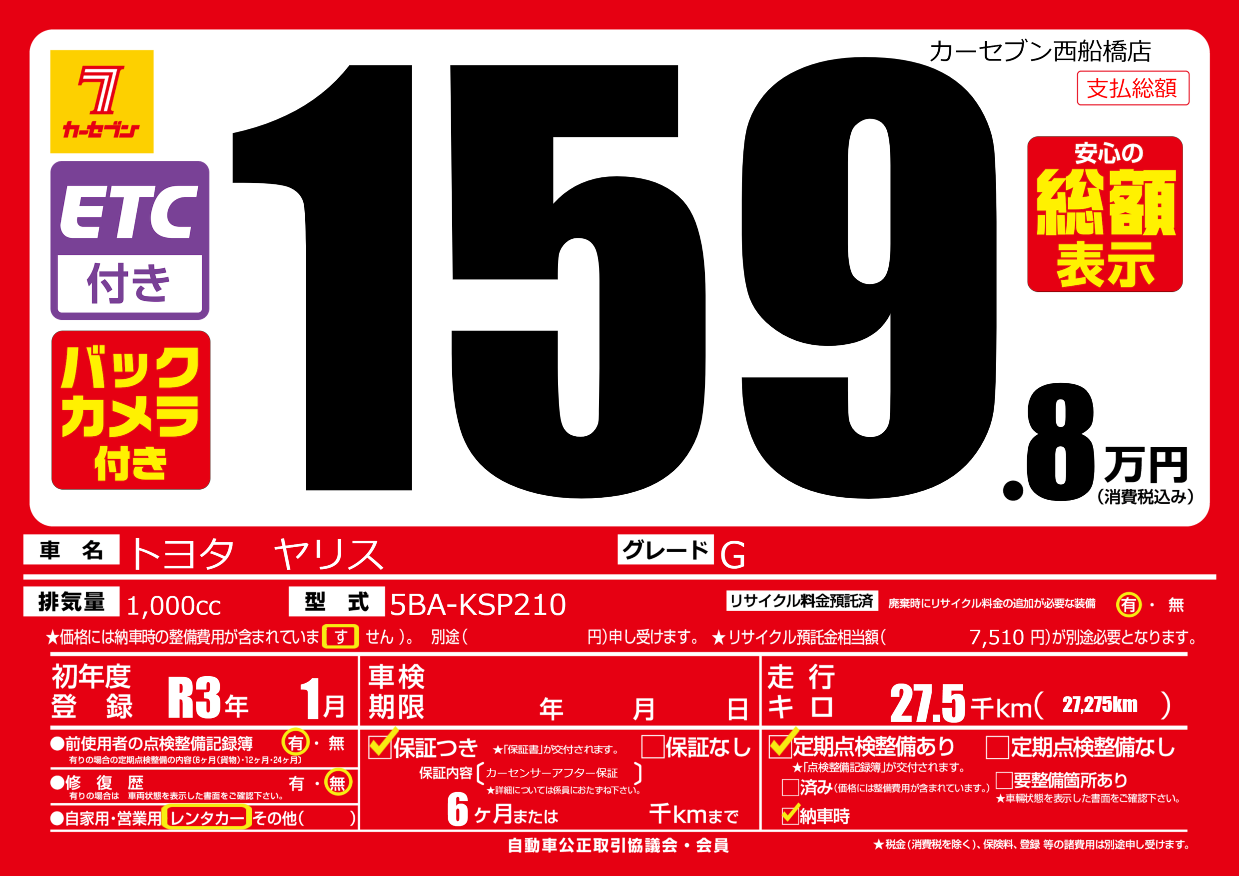 | 車名 | トヨタ ヤリス | グレード ミッション 排気量 |