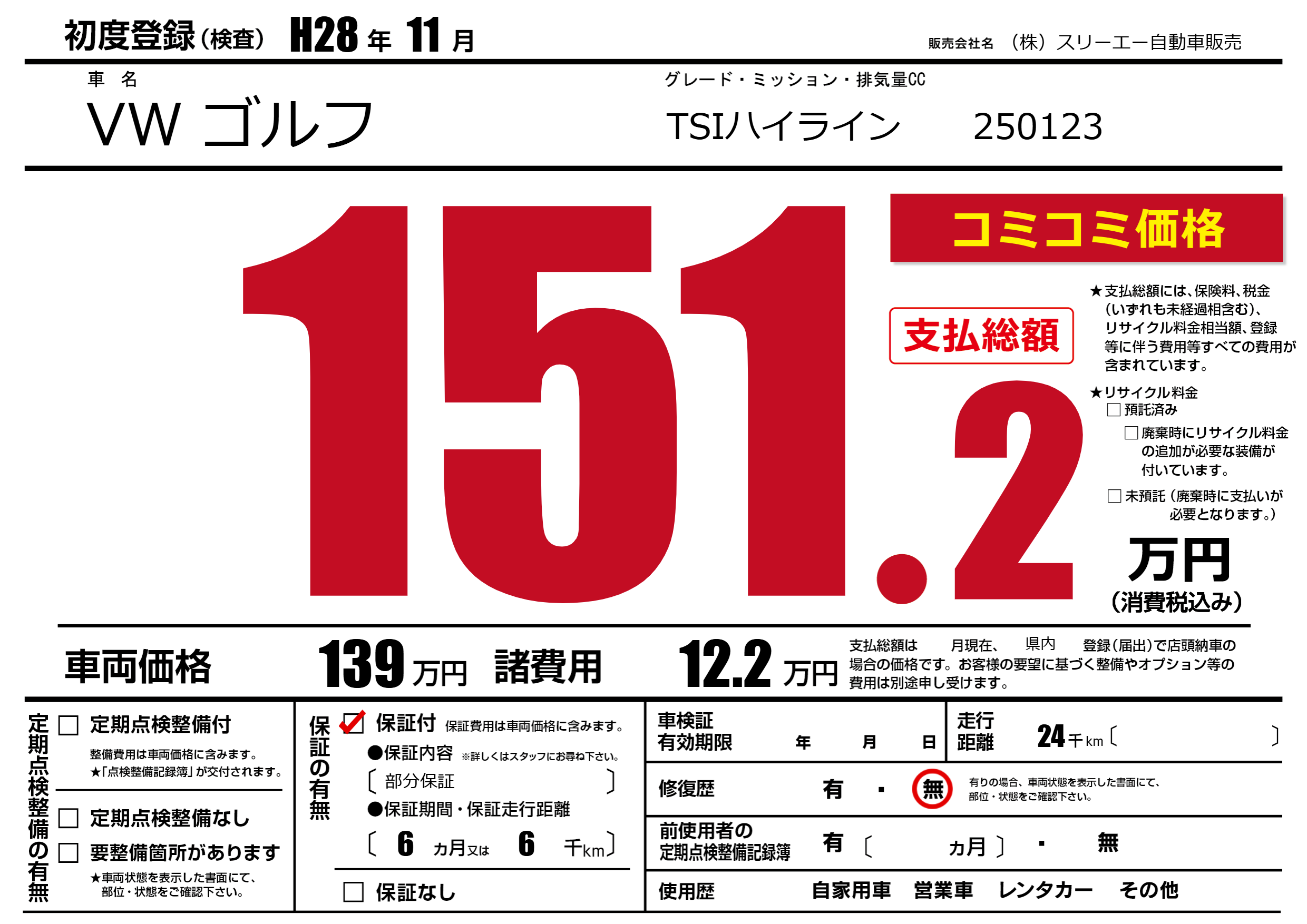 保証付き 保証内容(部分保証) 6ヶ月または(6)千kmまで |