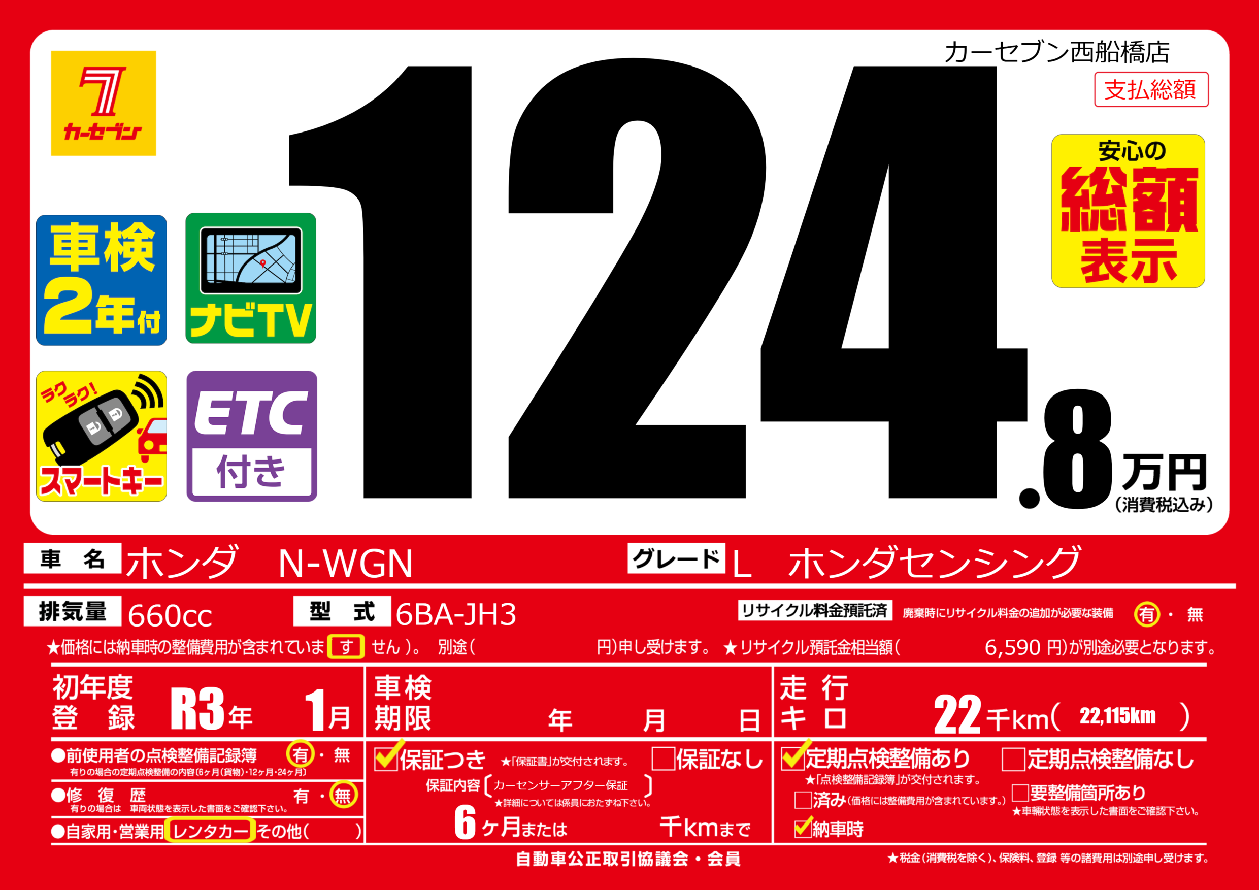 | 車名 | ホンダ N-WGN | グレード ミッション 排気量 |