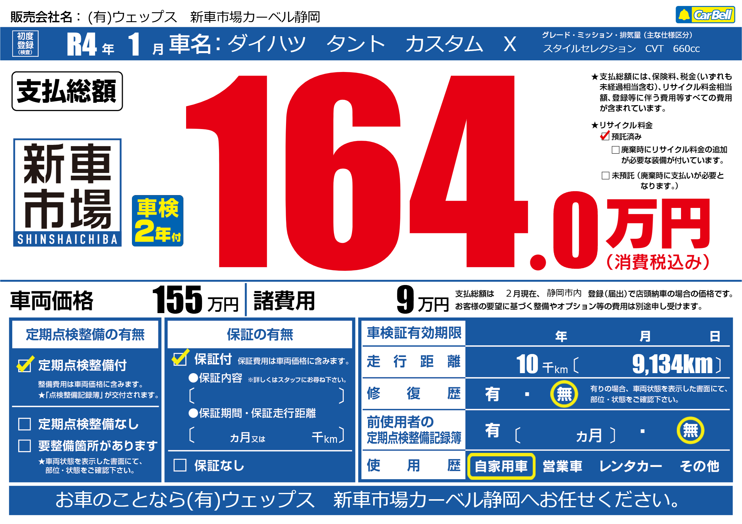 | 車名 | ダイハツ タント カスタム X | グレード ミッション 排気量 |