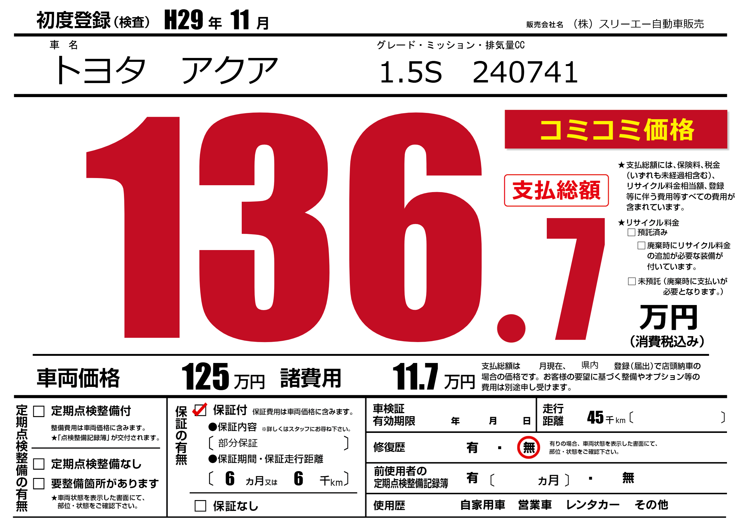 | 車名 | トヨタ アクア | グレード ミッション 排気量 |
