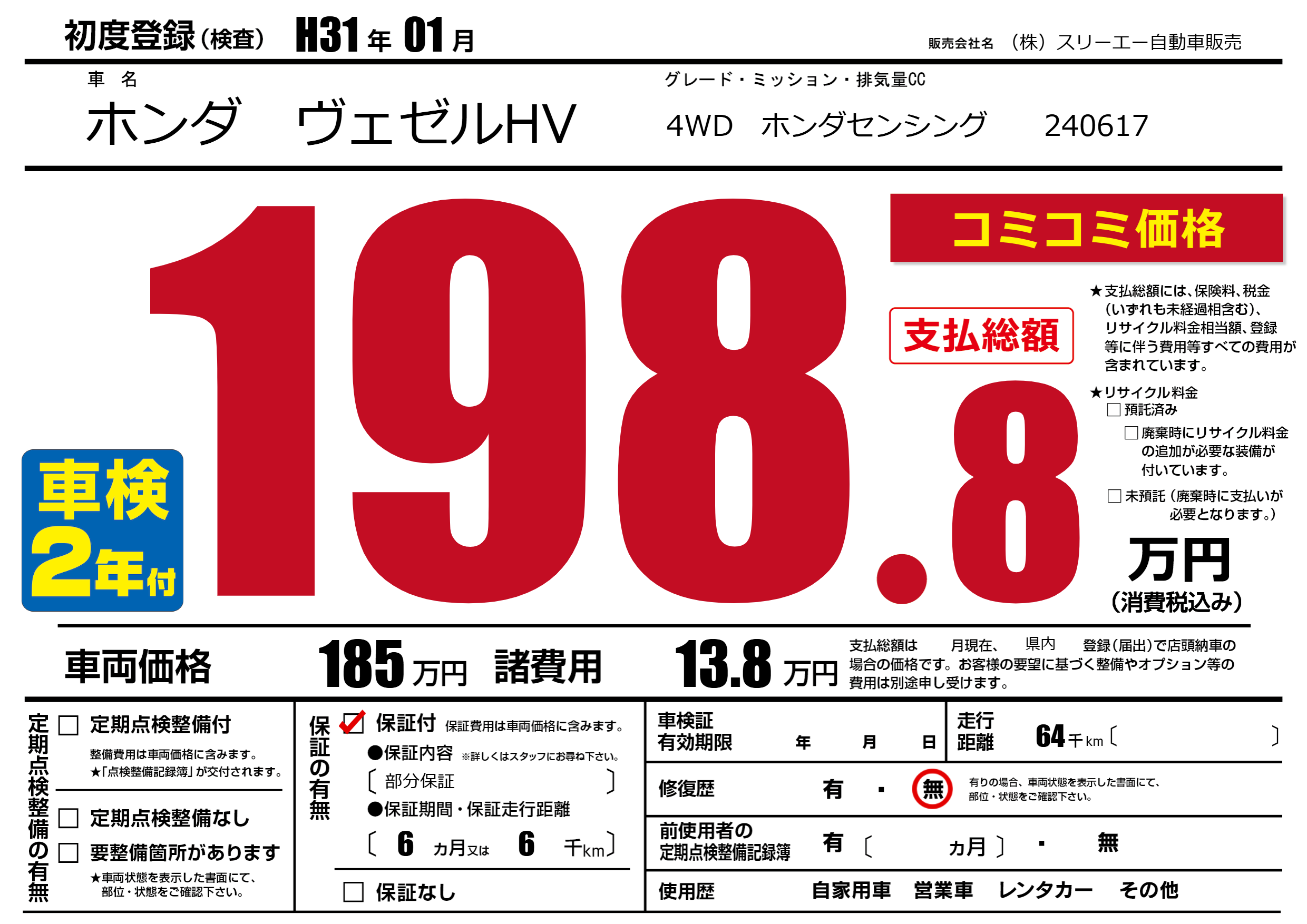 | 車名 | ホンダ ヴェゼルHV | グレード ミッション 排気量 |