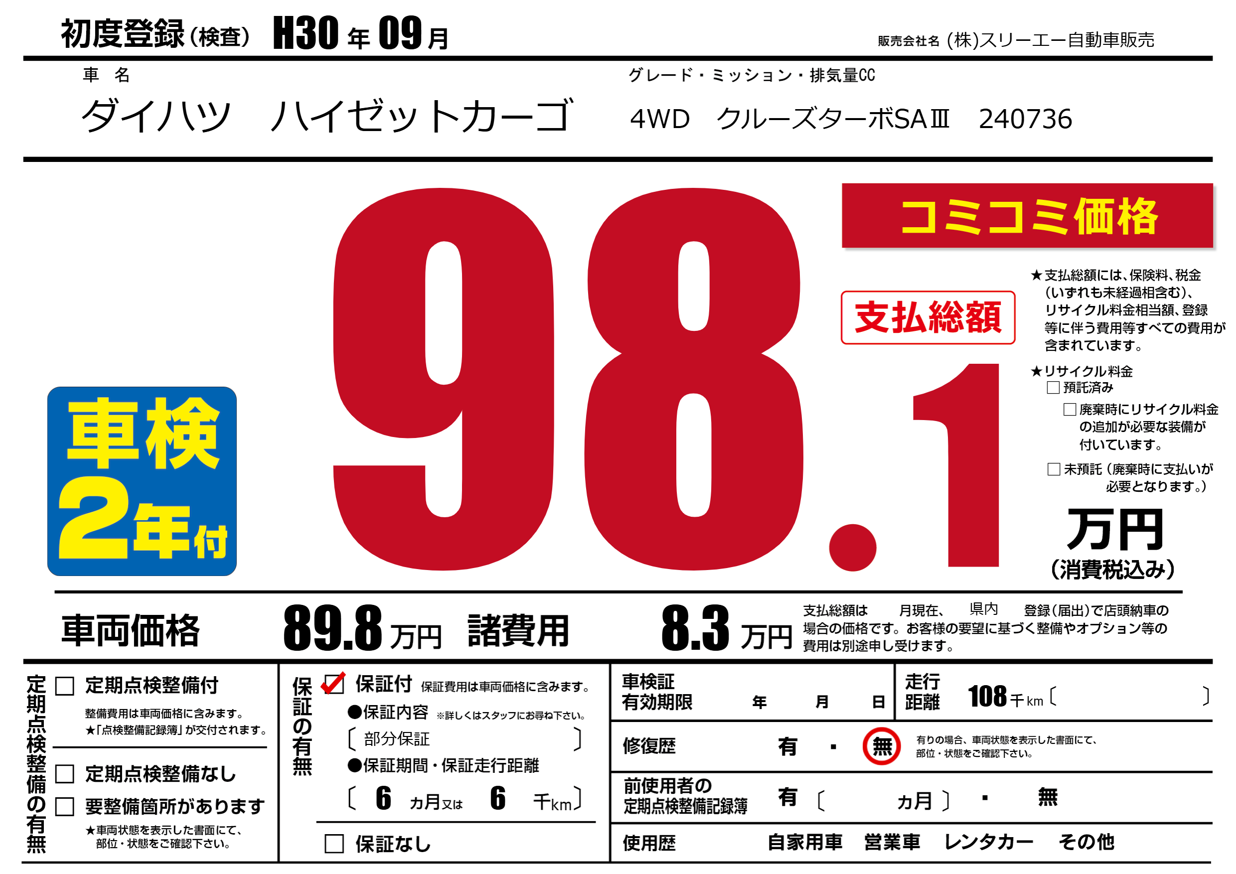 保証付き 保証内容(部分保証) 6ヶ月または(6)千kmまで |