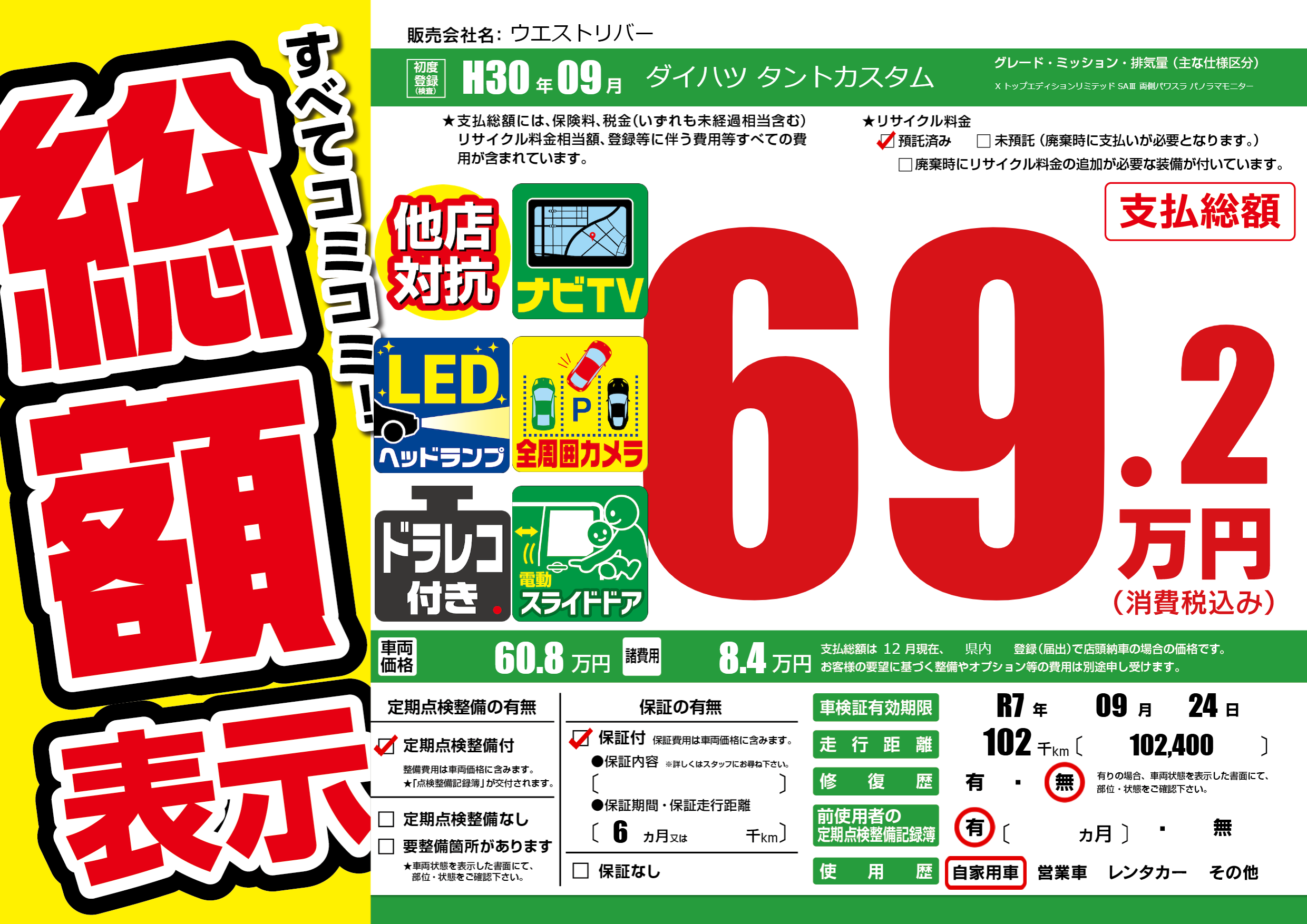 | 走行キロ | 10.2万km | 初年度登録 | H30年09月 |