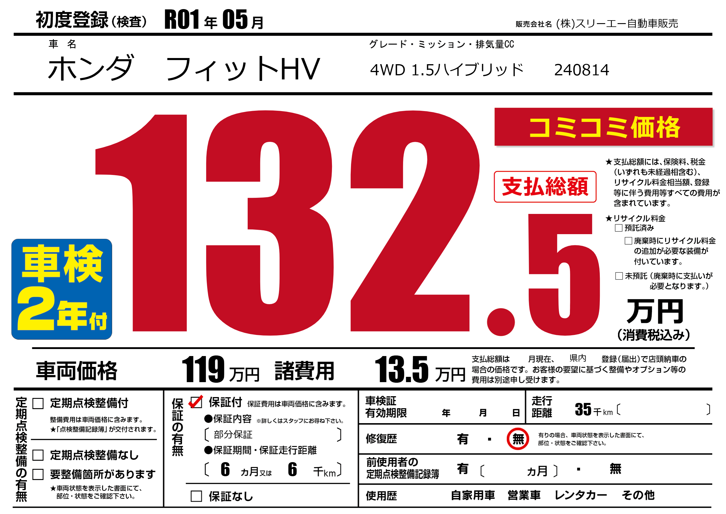 | 走行キロ | 3.5万km | 初年度登録 | R01年05月 |