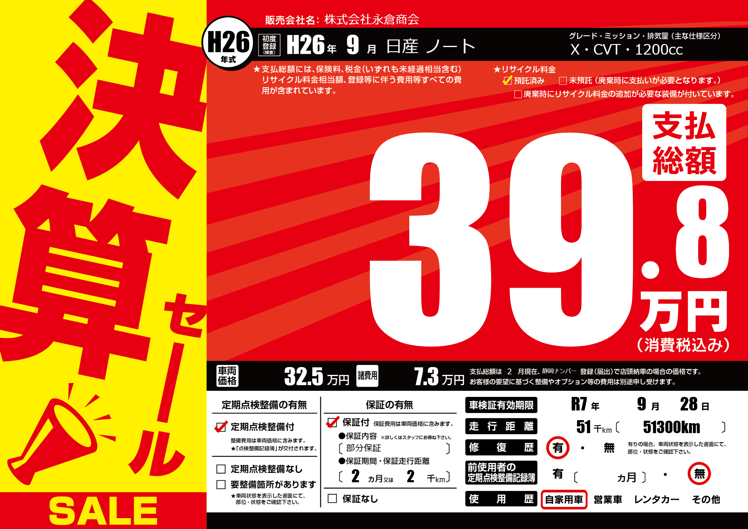| 走行キロ | 5.1万km | 初年度登録 | H26年9月 |