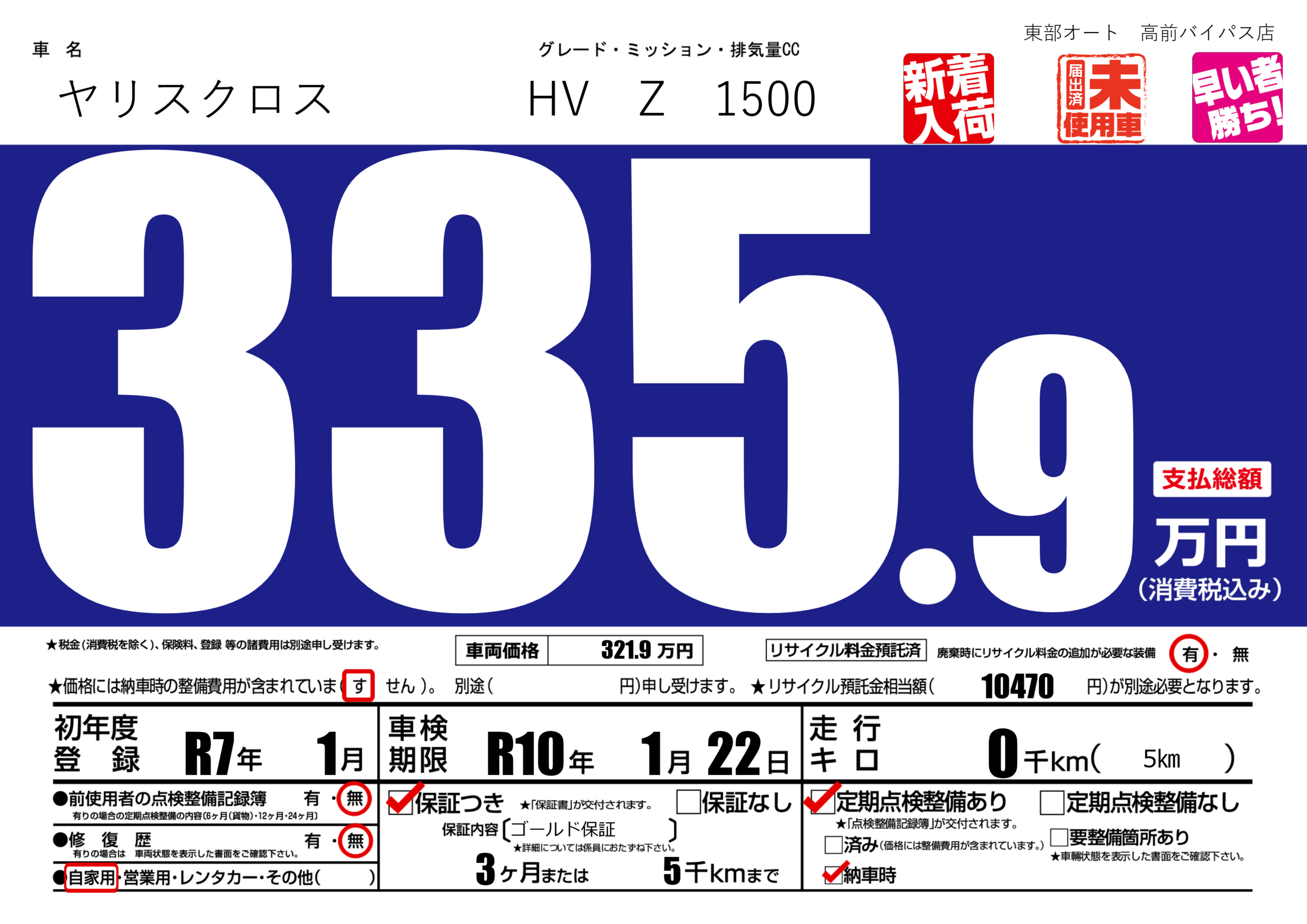 | 車名 | ヤリスクロス | グレード ミッション 排気量 |