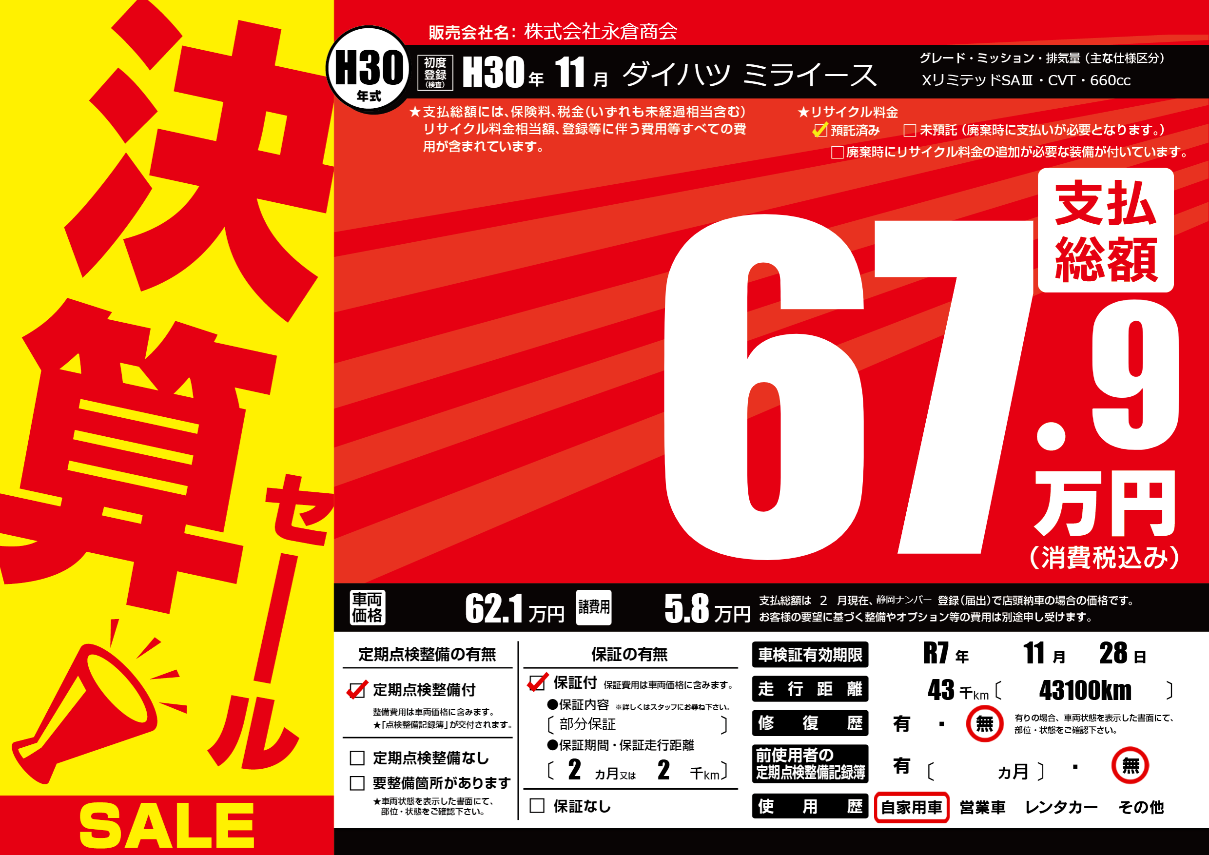 | 走行キロ | 4.3万km | 初年度登録 | H30年11月 |