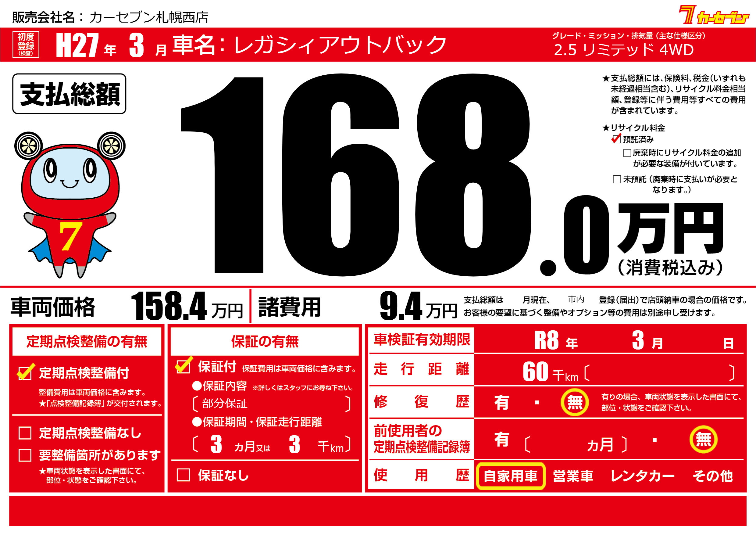 | 車名 | レガシィアウトバック | グレード ミッション 排気量 |