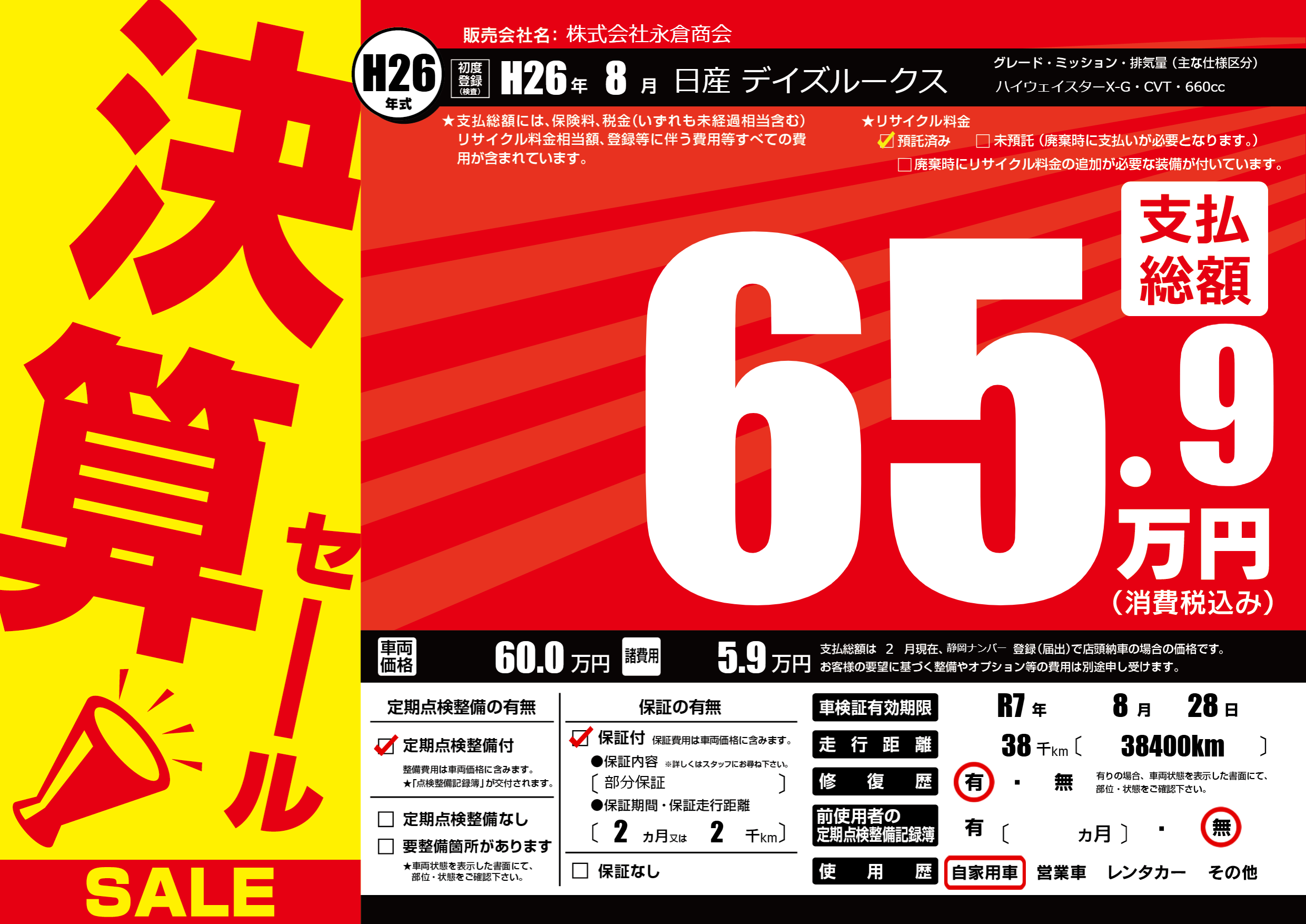 | 車名 | 日産 デイズルークス | グレード ミッション 排気量 |
