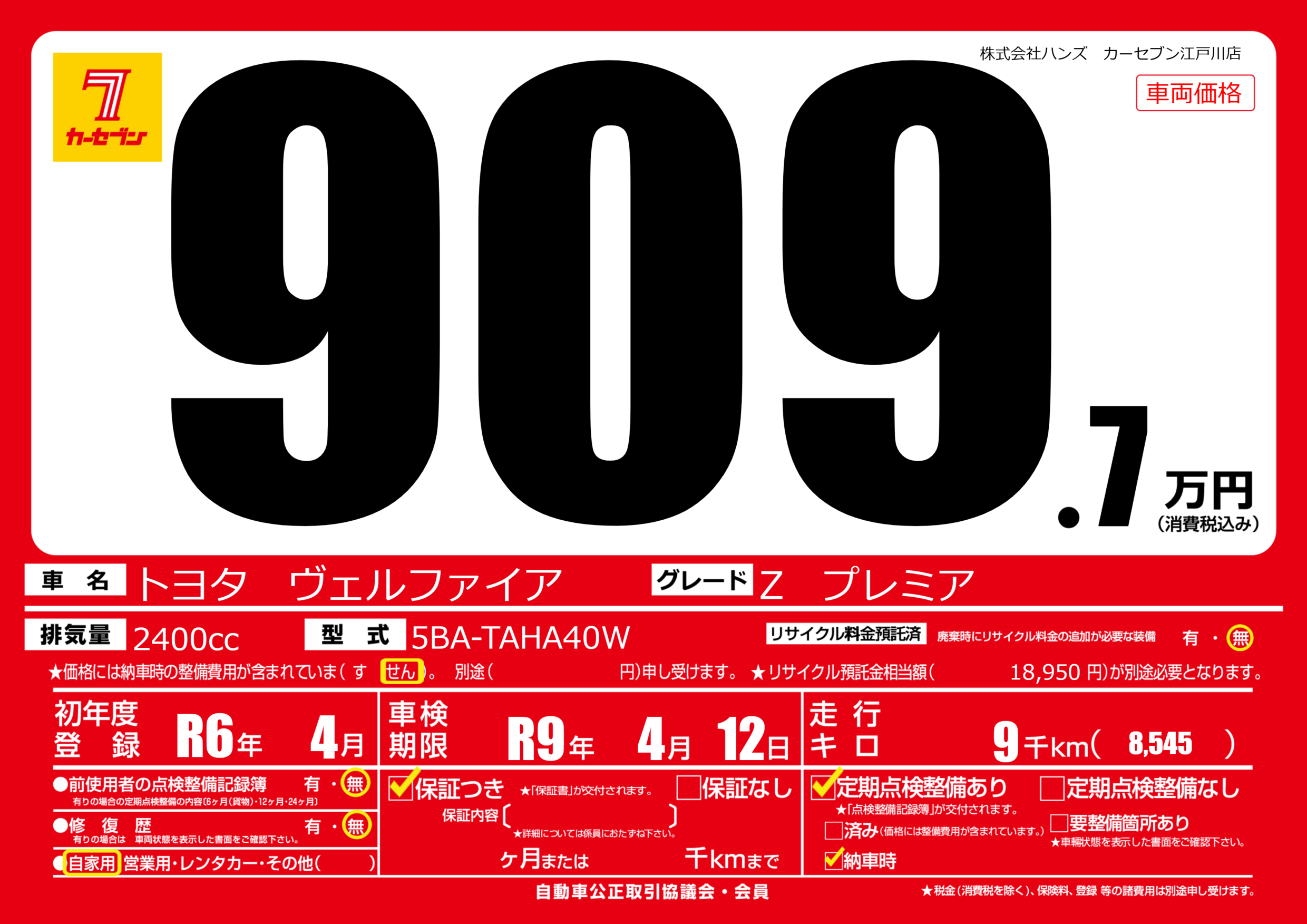 なし | 車検制限 | R9年4月12月 |