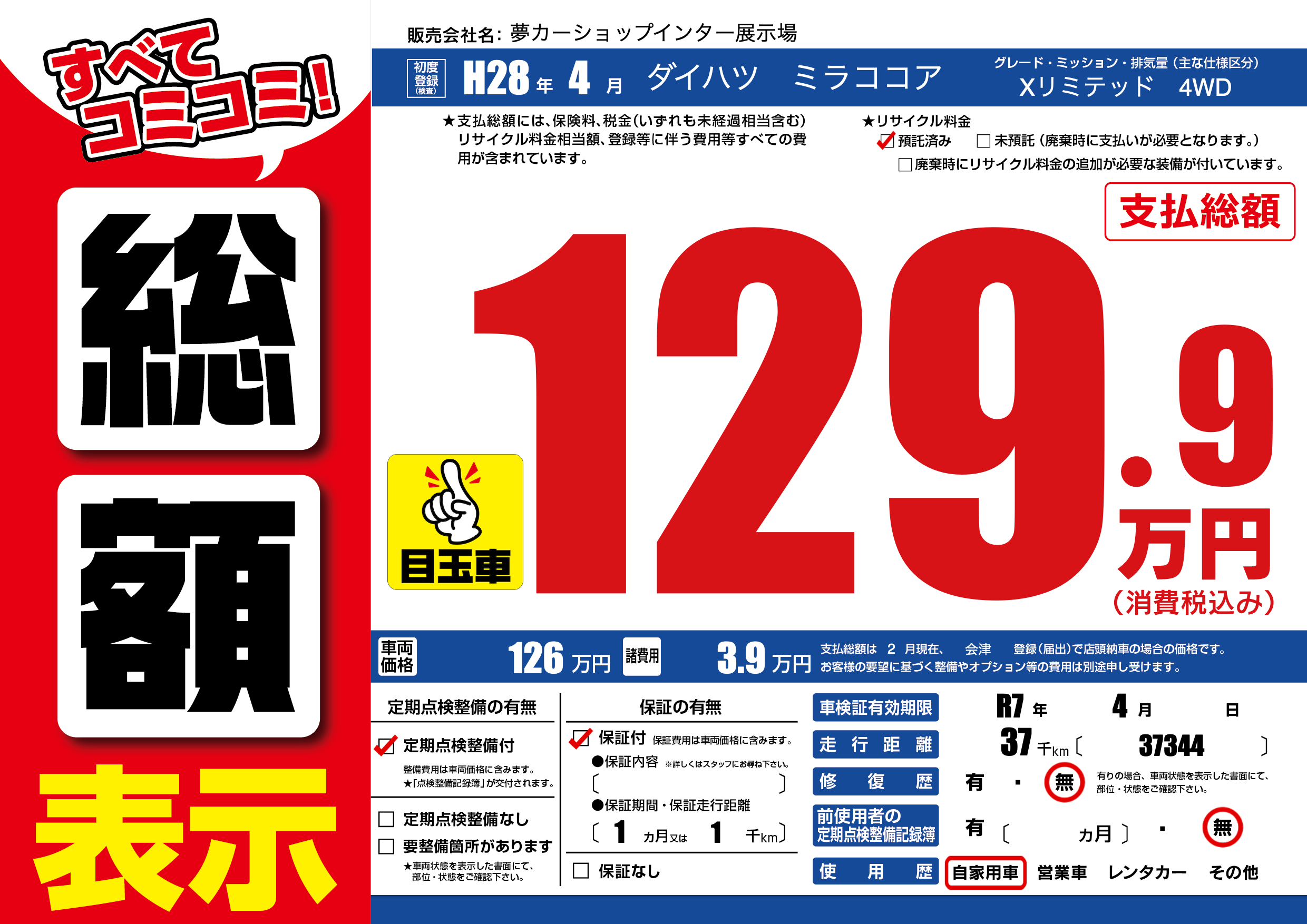 | 車名 | ダイハツ ミラココア | グレード ミッション 排気量 |