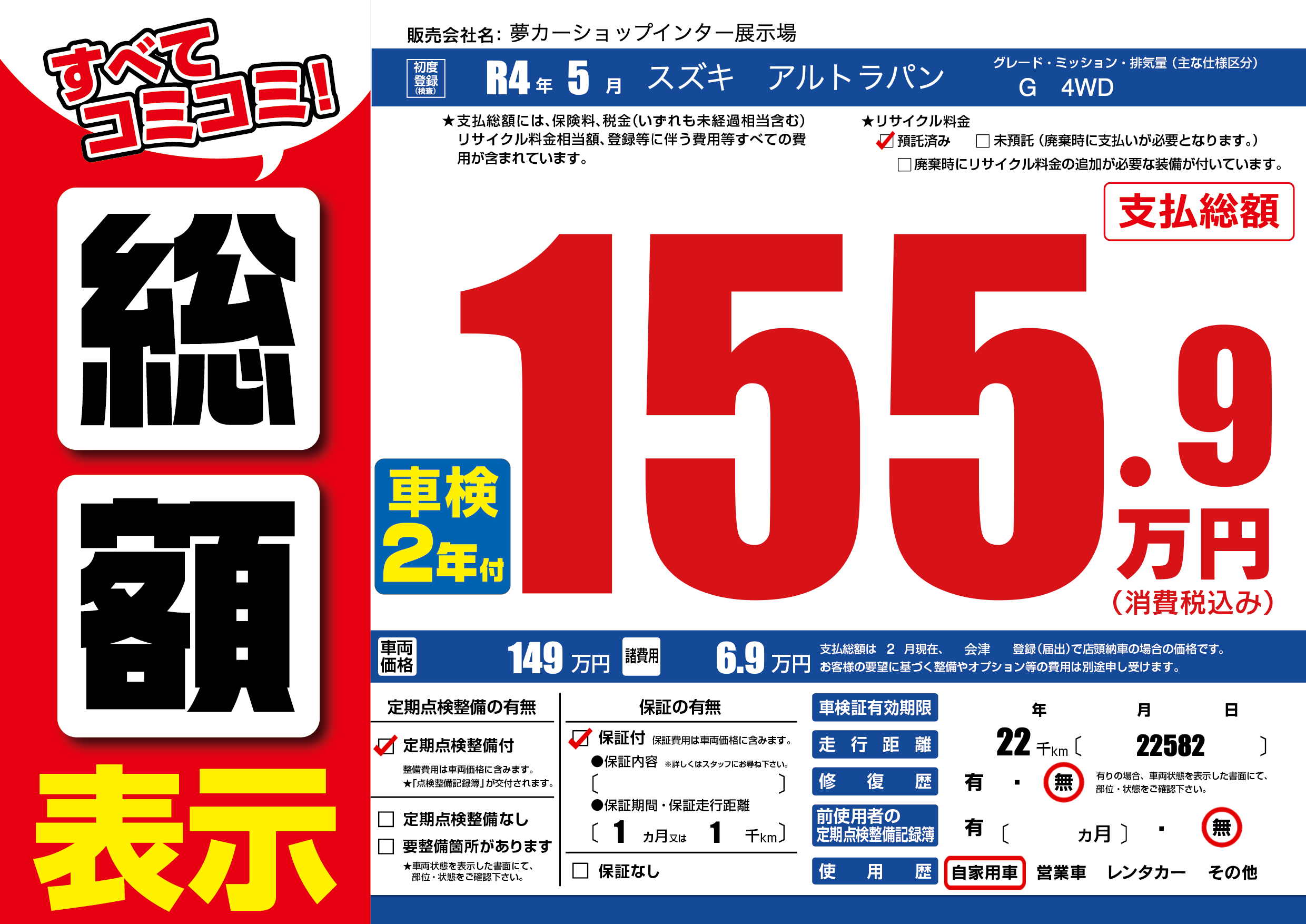 | 走行キロ | 2.2万km | 初年度登録 | R4年5月 |