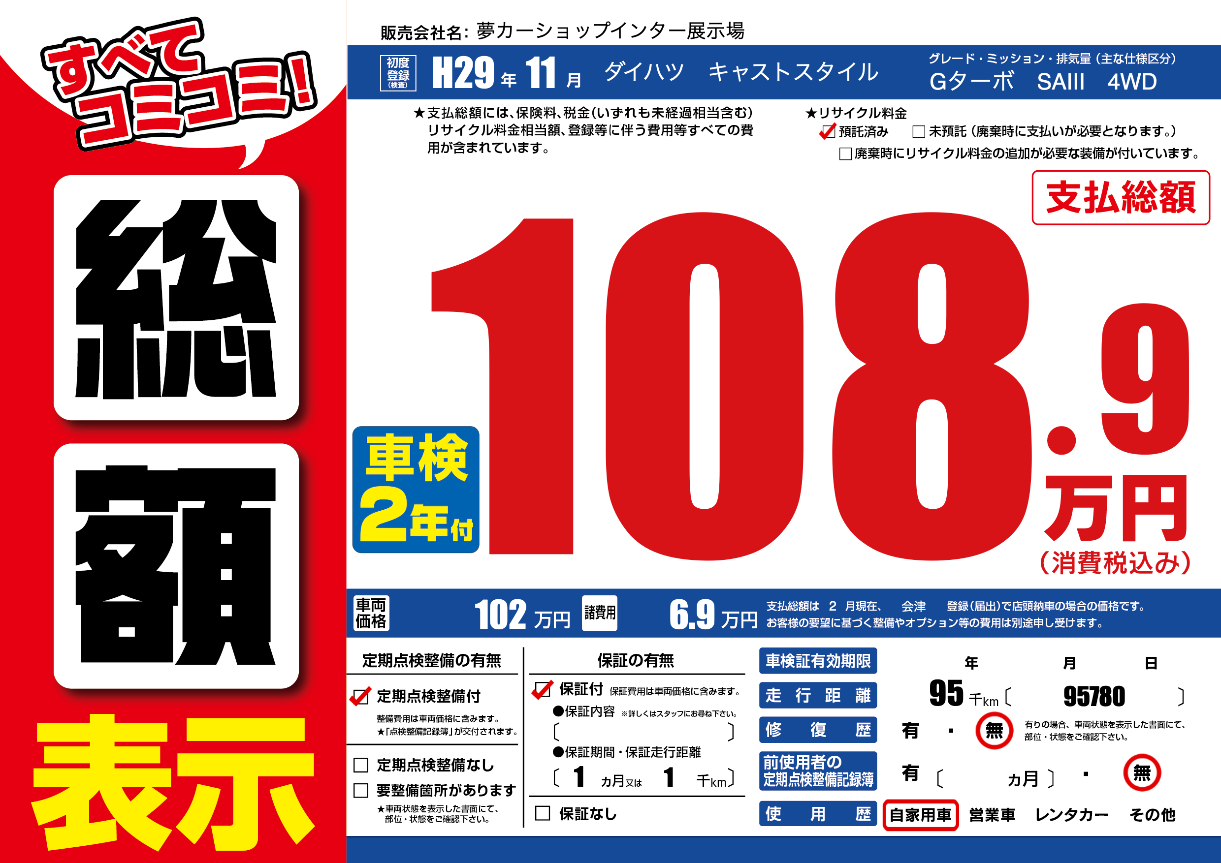 | 走行キロ | 9.5万km | 初年度登録 | H29年11月 |