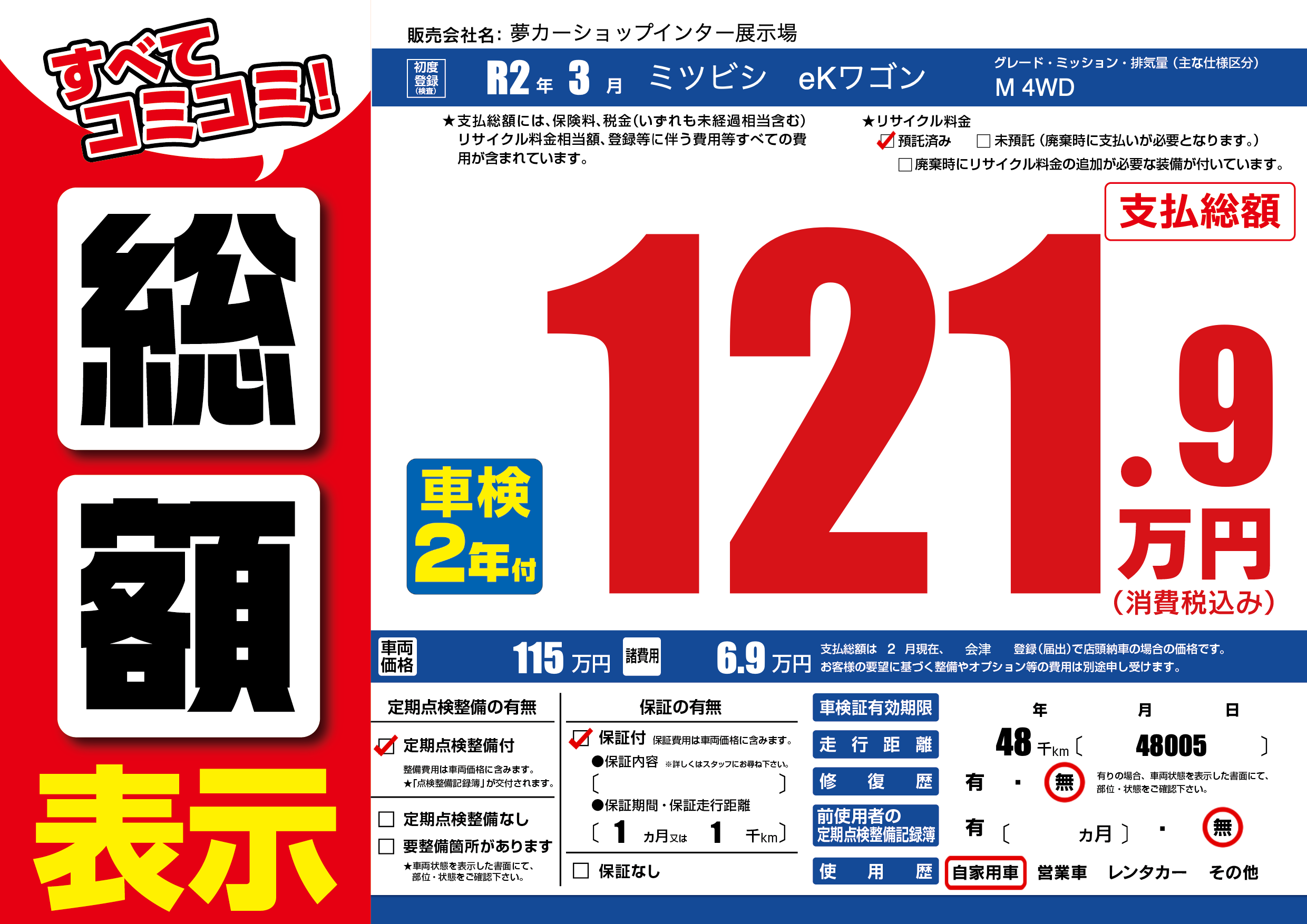 | 車名 | ミツビシ eKワゴン | グレード ミッション 排気量 |