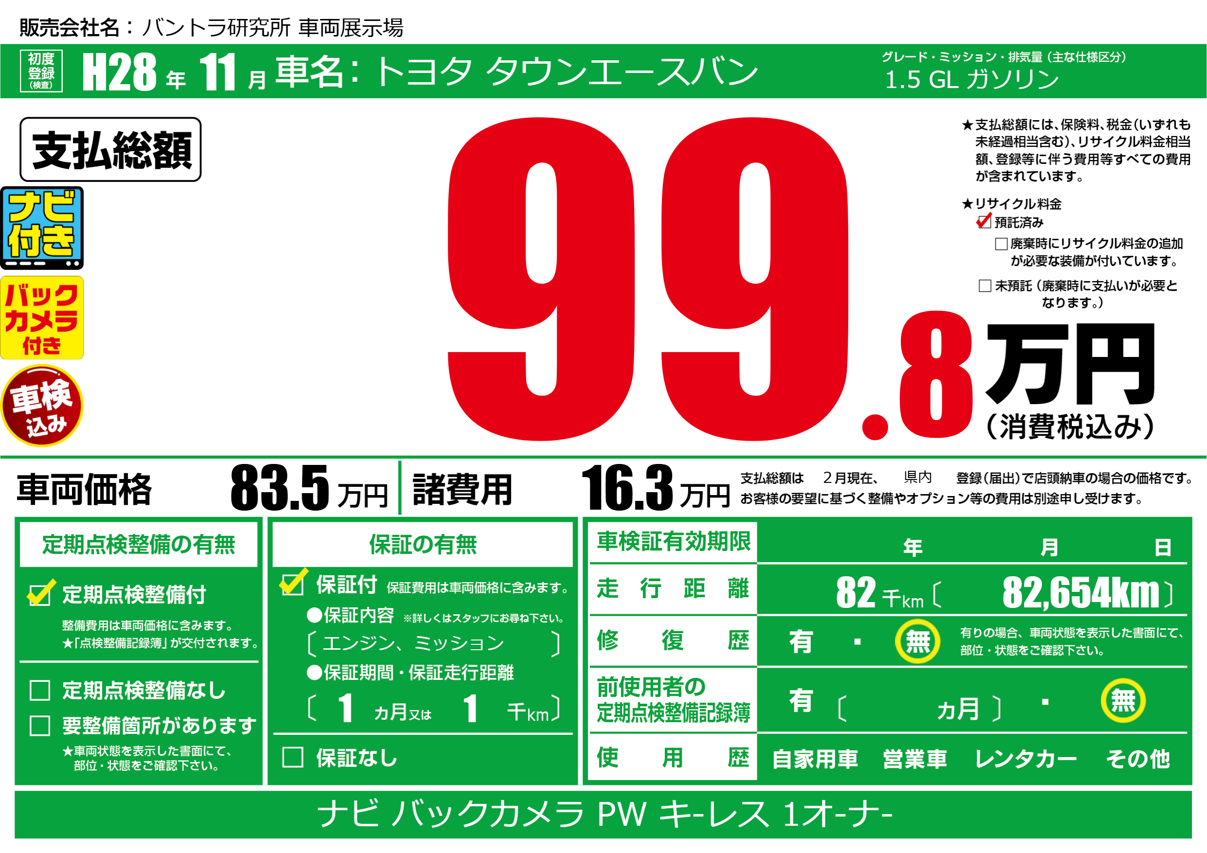 | 車名 | トヨタ タウンエースバン | グレード ミッション 排気量 |