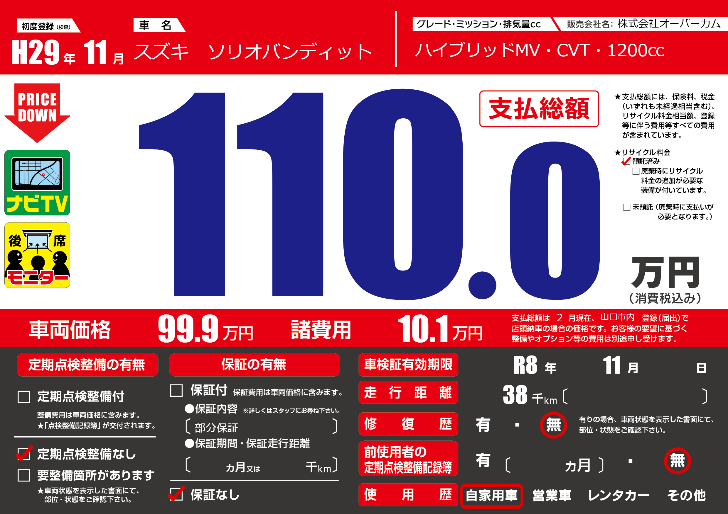 | 走行キロ | 3.8万km | 初年度登録 | H29年11月 |