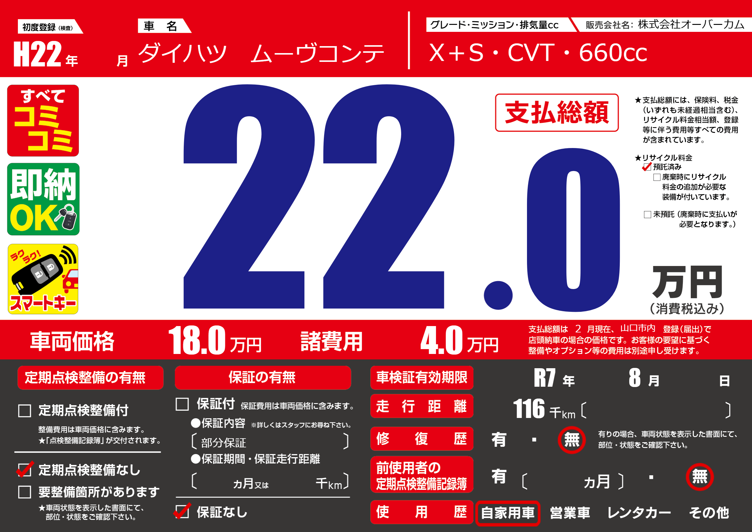 | 車名 | ダイハツ ムーヴコンテ | グレード ミッション 排気量 |