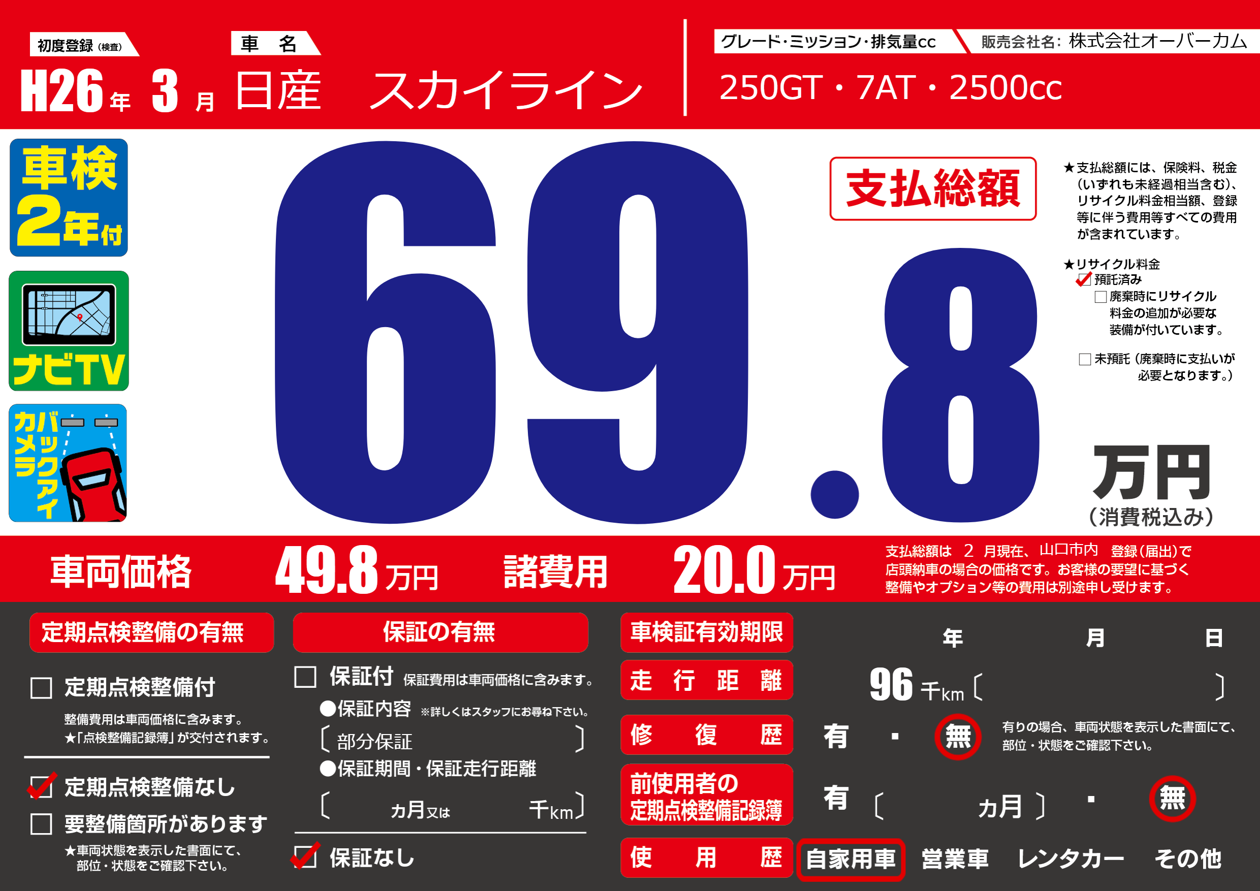 | 走行キロ | 9.6万km | 初年度登録 | H26年3月 |