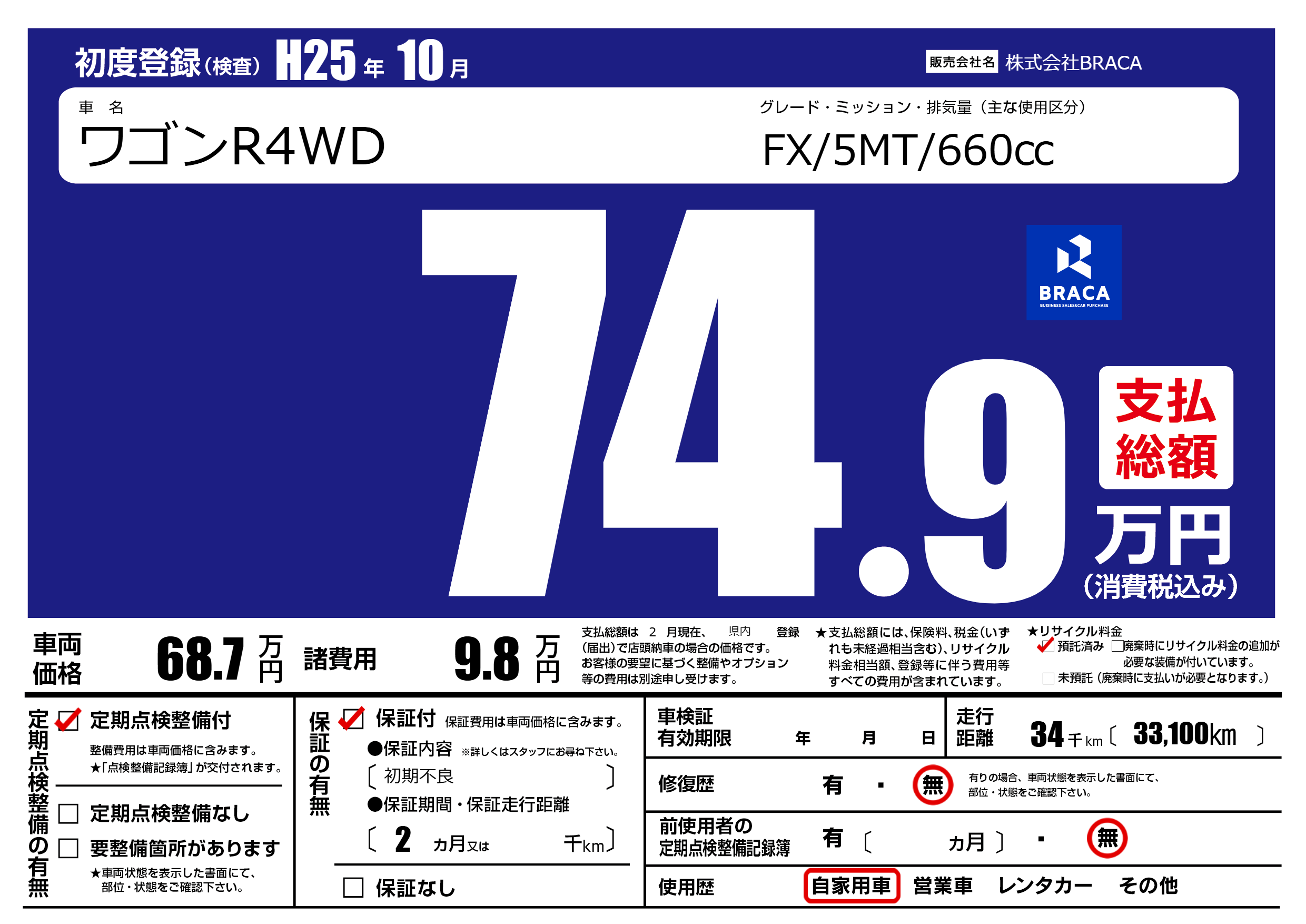 | 走行キロ | 3.4万km | 初年度登録 | H25年10月 |