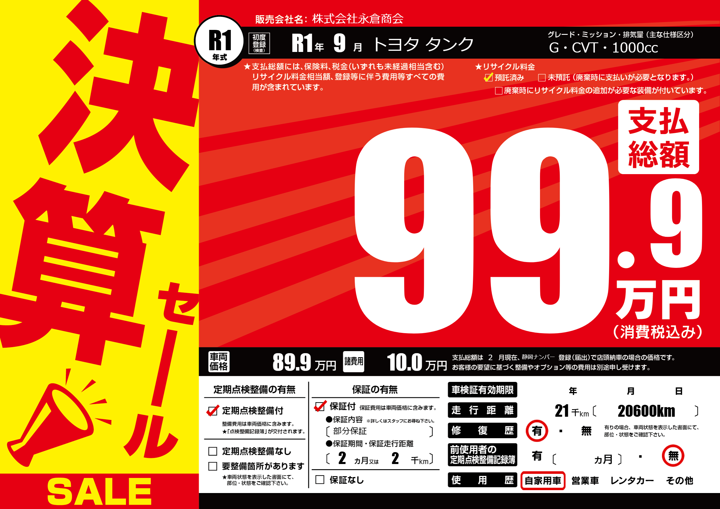 | 車名 | トヨタ タンク | グレード ミッション 排気量 |
