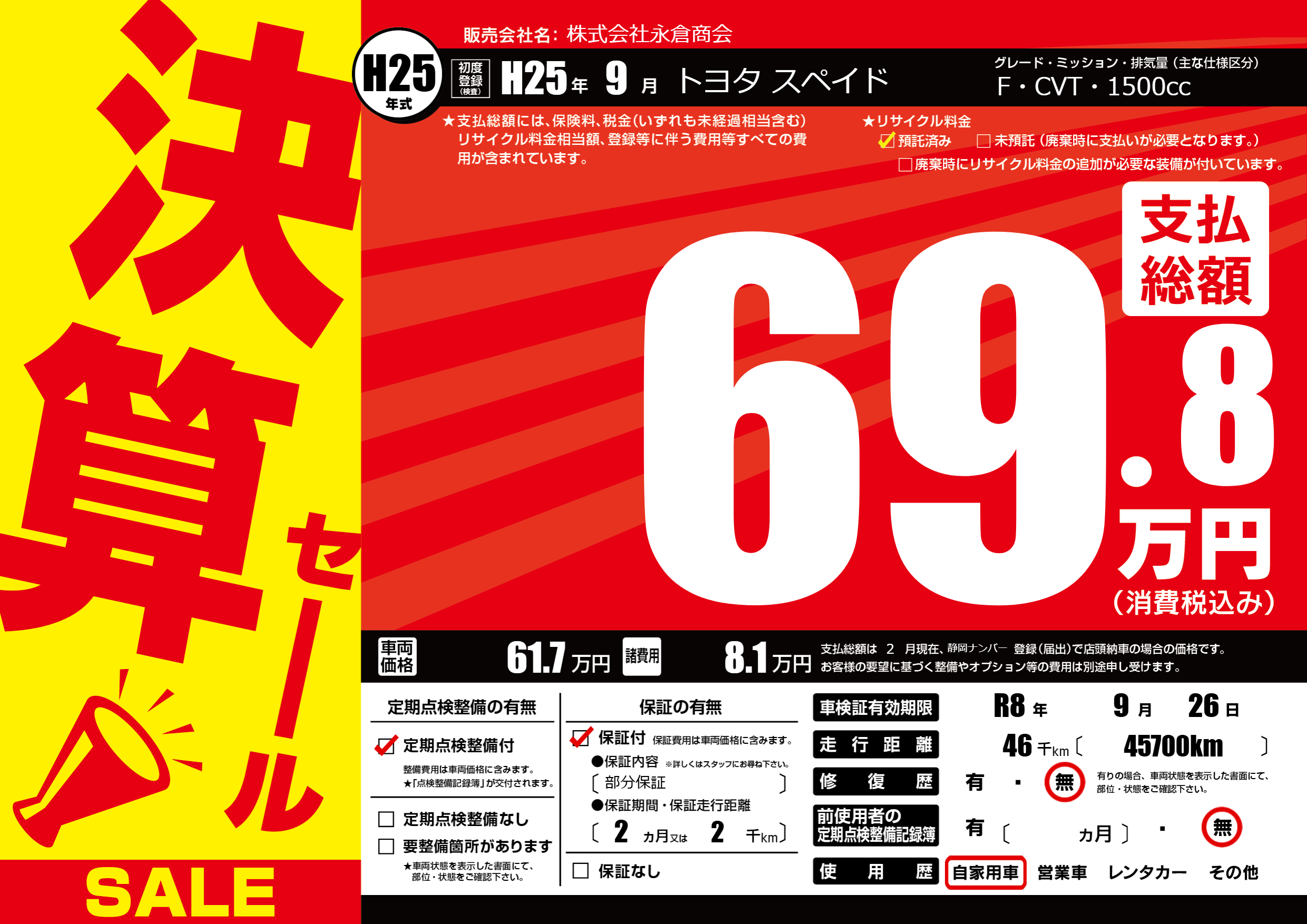 | 車名 | トヨタ スペイド | グレード ミッション 排気量 |