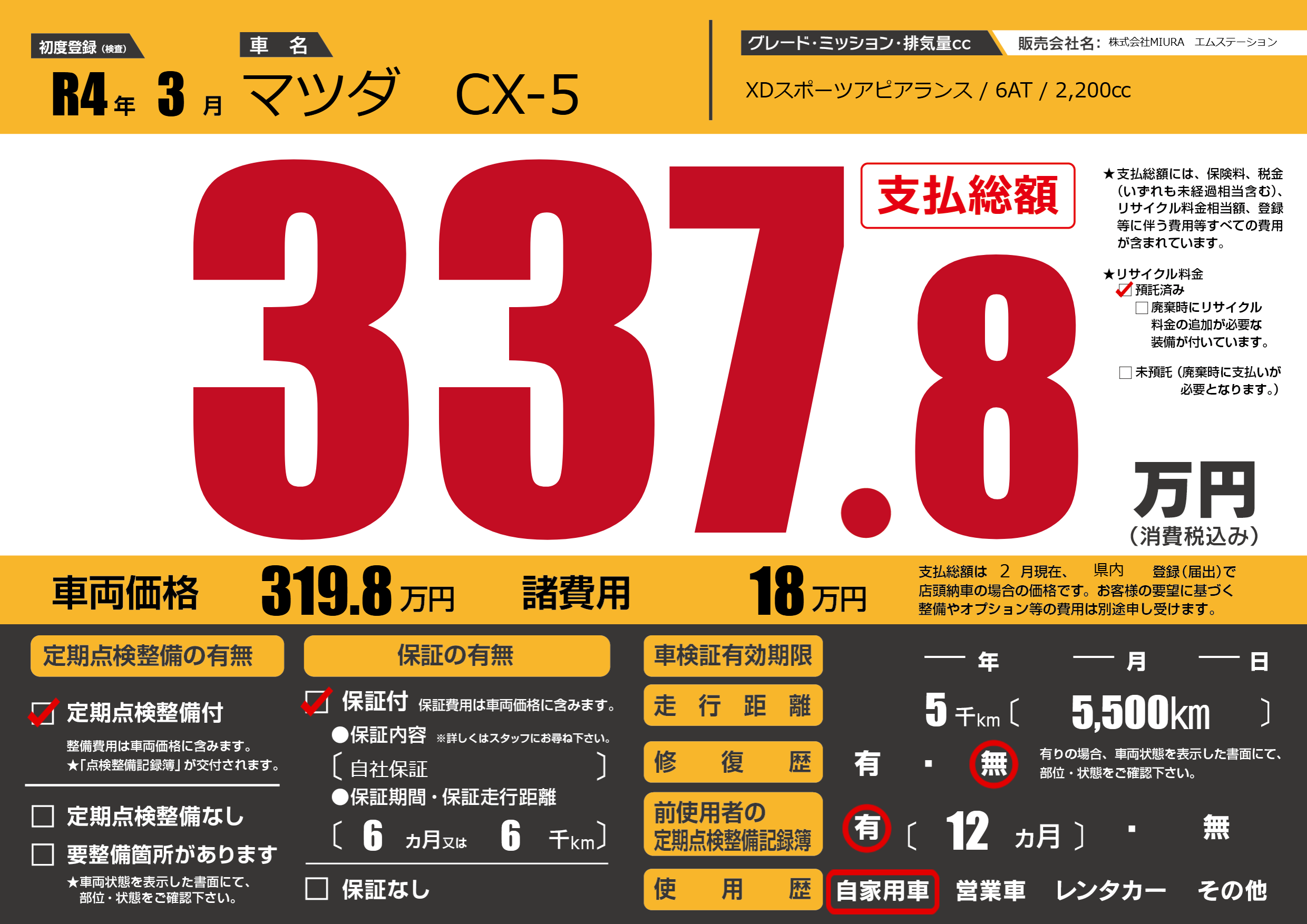 | 車名 | マツダ CX-5 | グレード ミッション 排気量 |