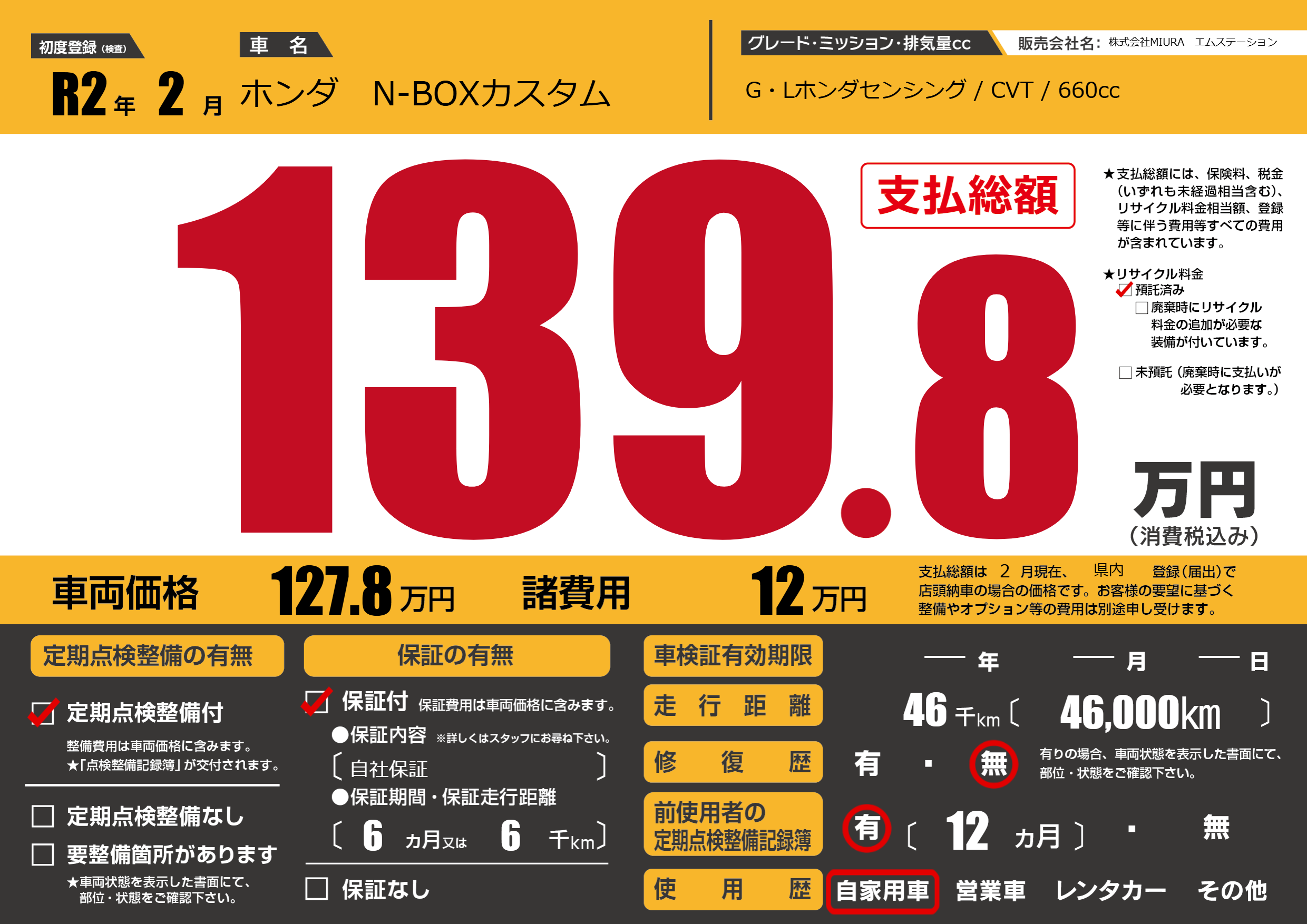| 走行キロ | 4.6万km | 初年度登録 | R2年2月 |