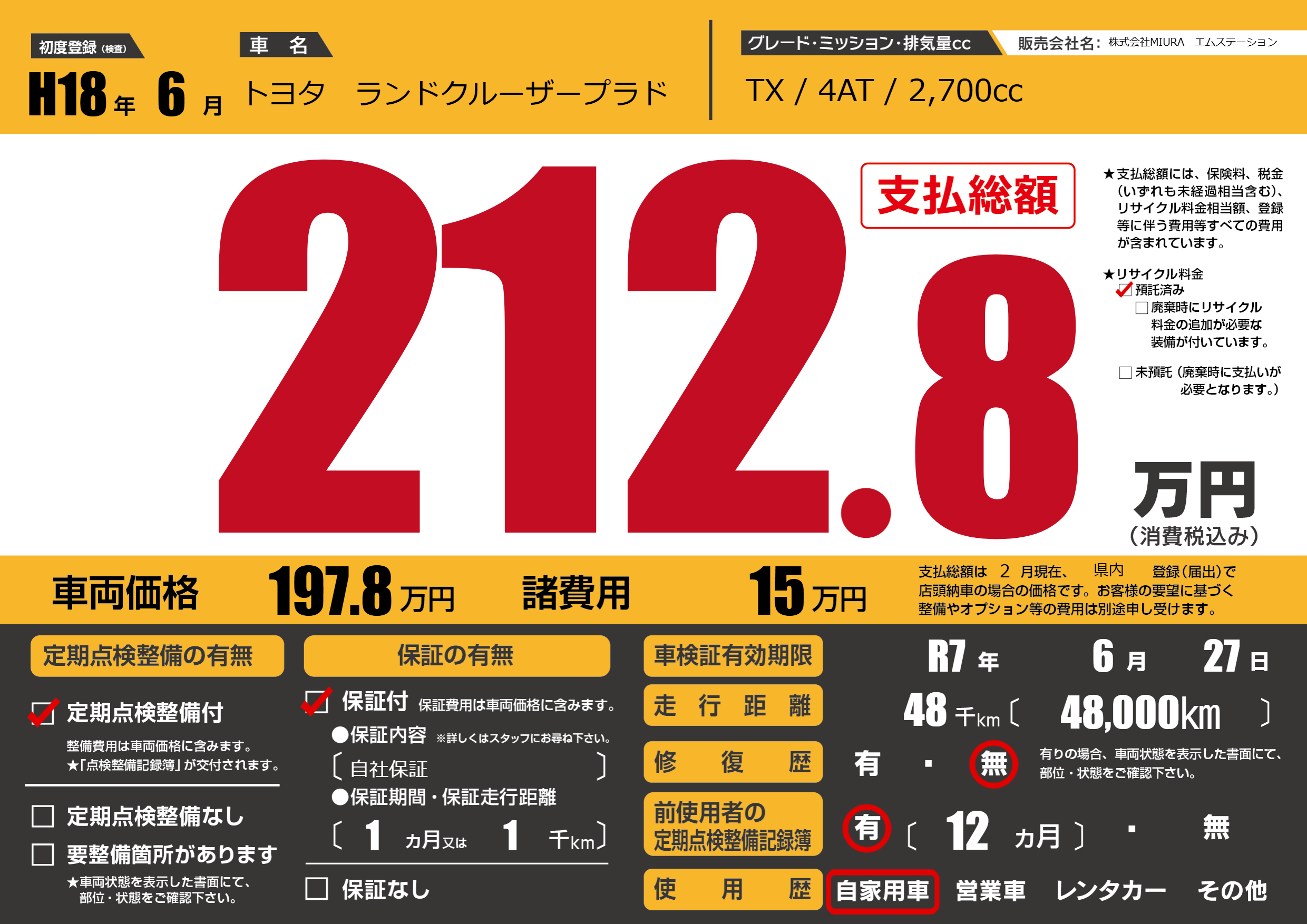 | 車名 | トヨタ ランドクルーザープラド | グレード ミッション 排気量 |