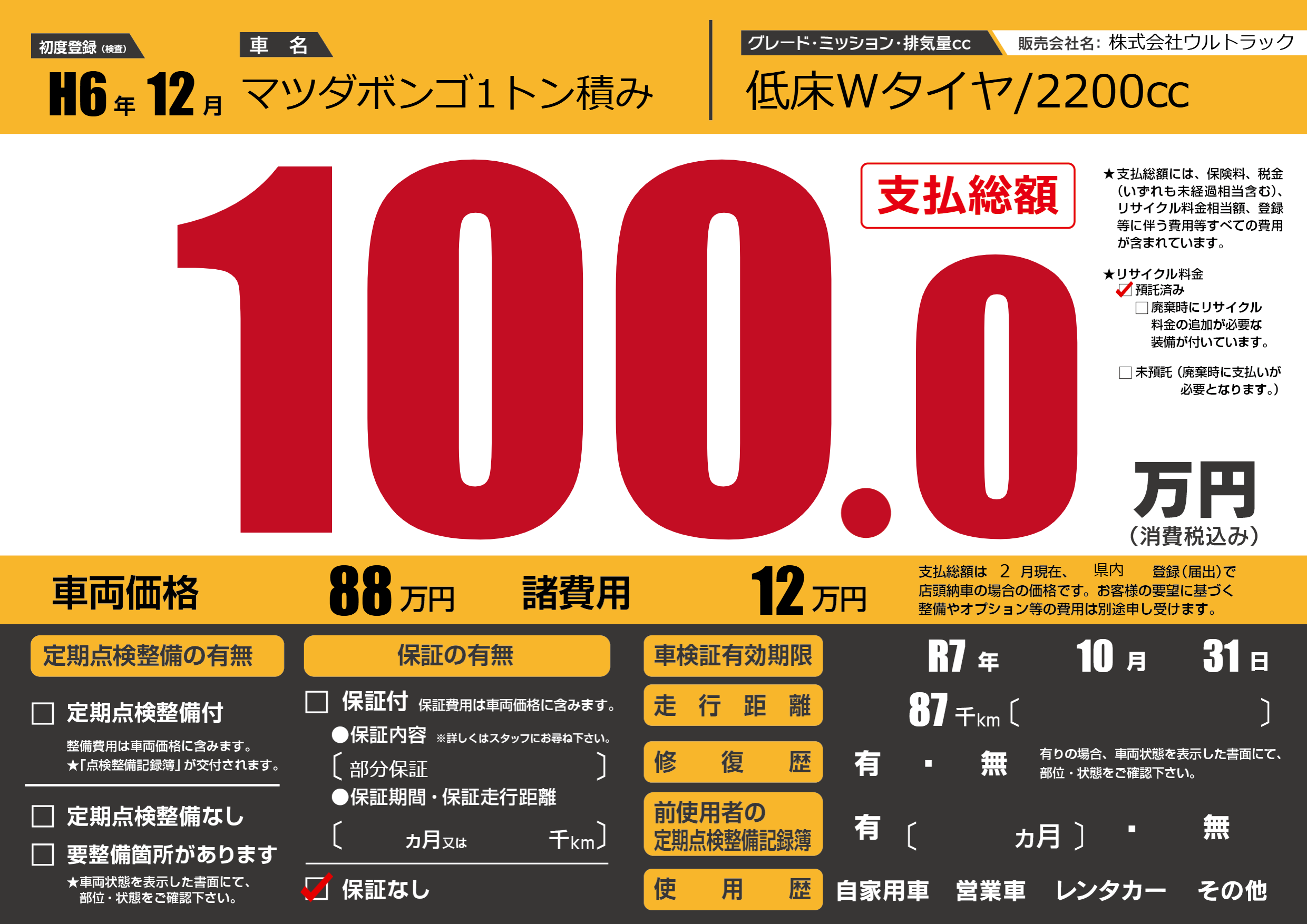 | 走行キロ | 8.7万km | 初年度登録 | H6年12月 |