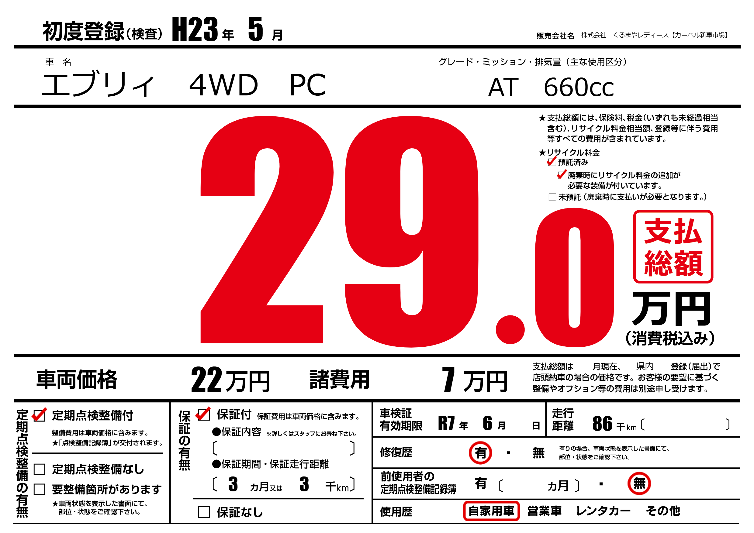 | 車名 | エブリィ 4WD PC | グレード ミッション 排気量 |