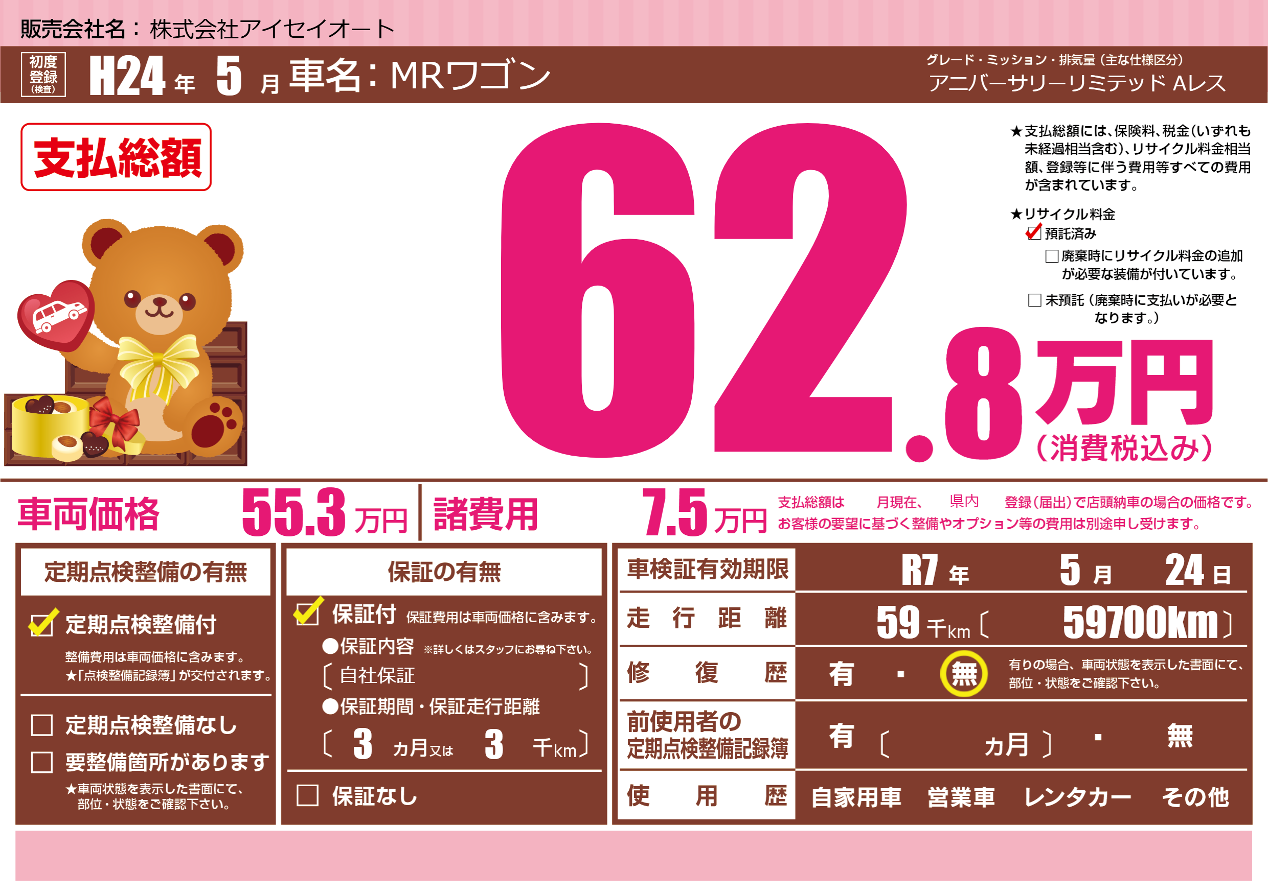 | 車名 | MRワゴン | グレード ミッション 排気量 |