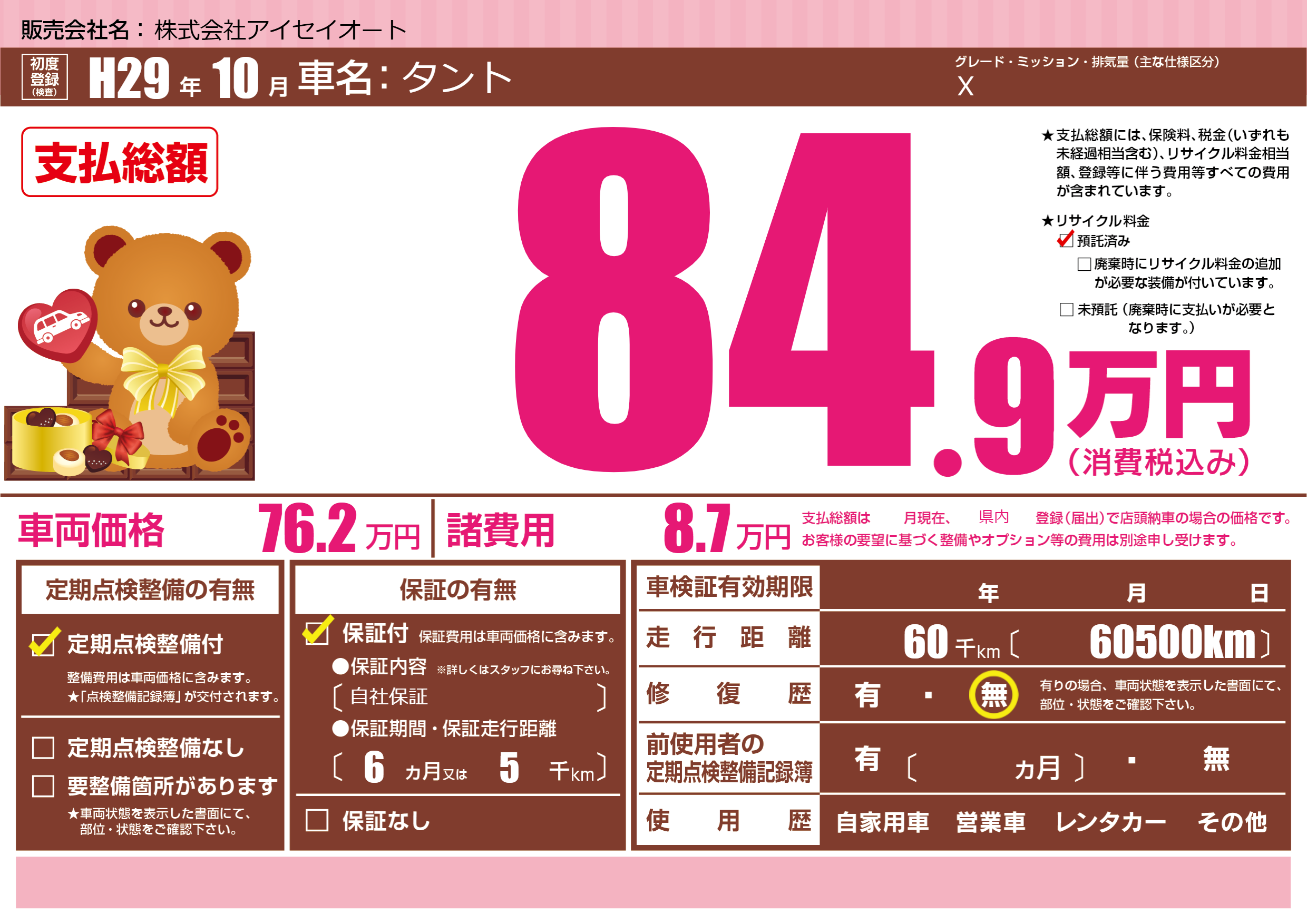 | 車名 | タント | グレード ミッション 排気量 |