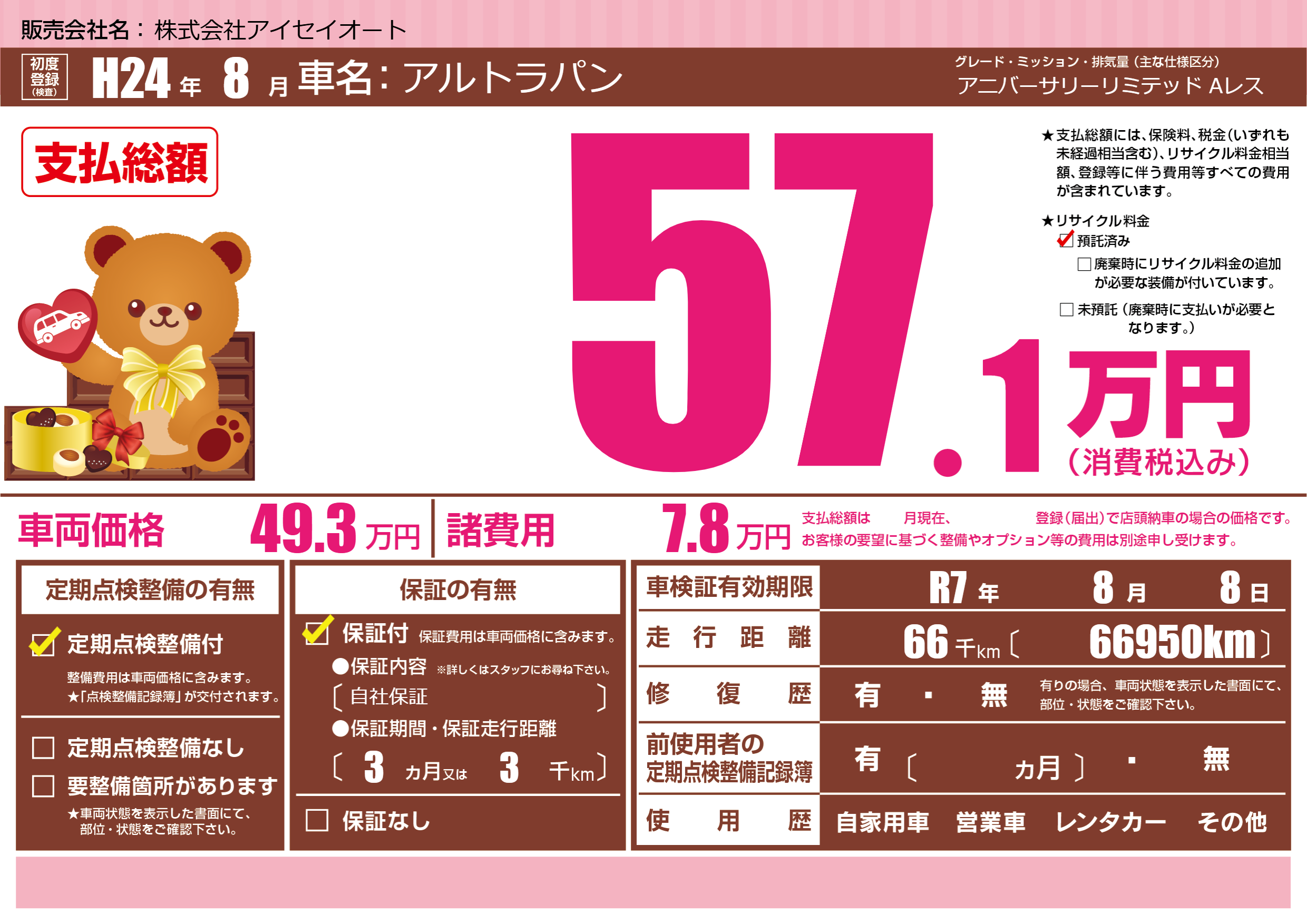 | 走行キロ | 6.6万km | 初年度登録 | H24年8月 |