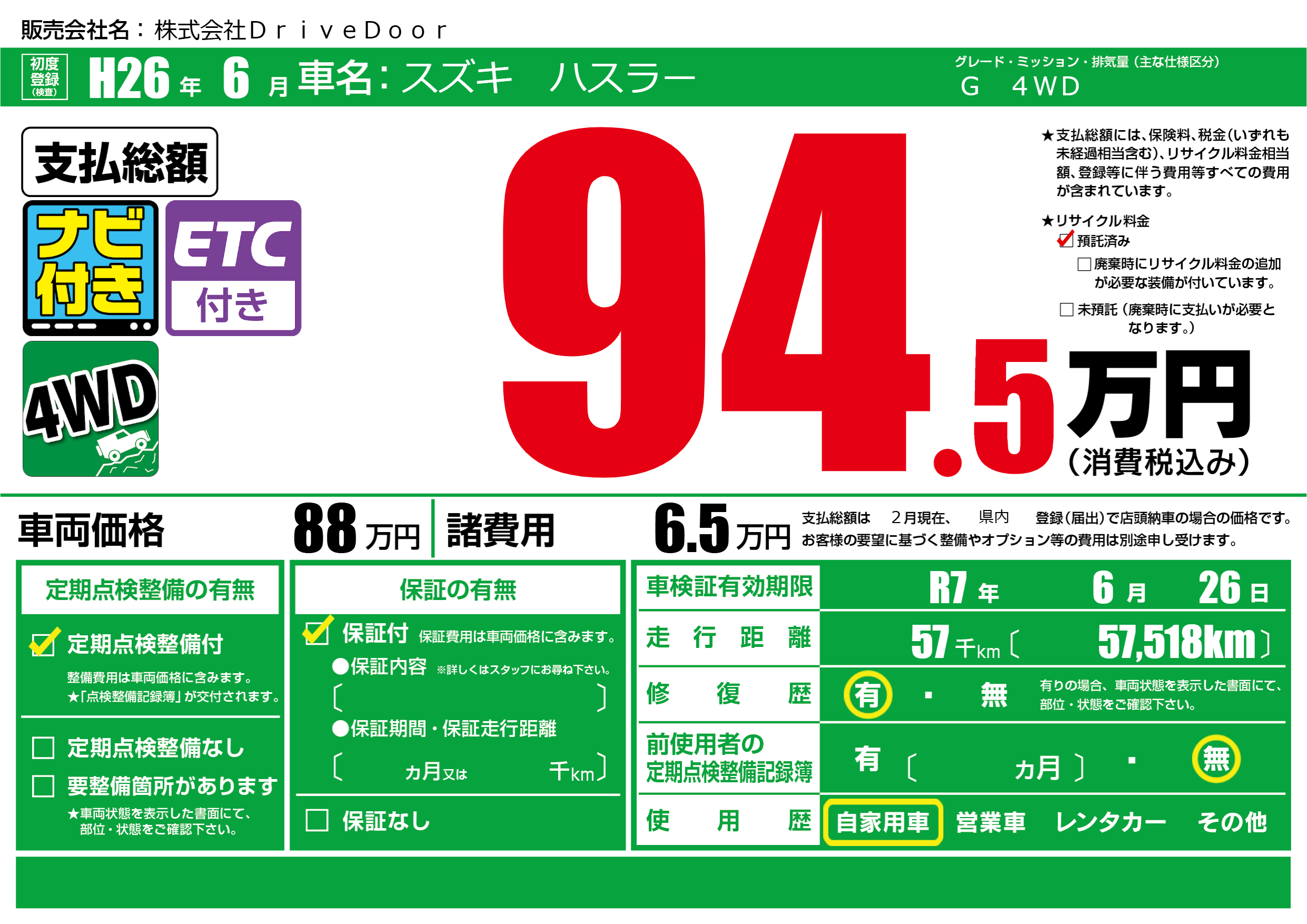 | 車名 | スズキ ハスラー | グレード ミッション 排気量 |