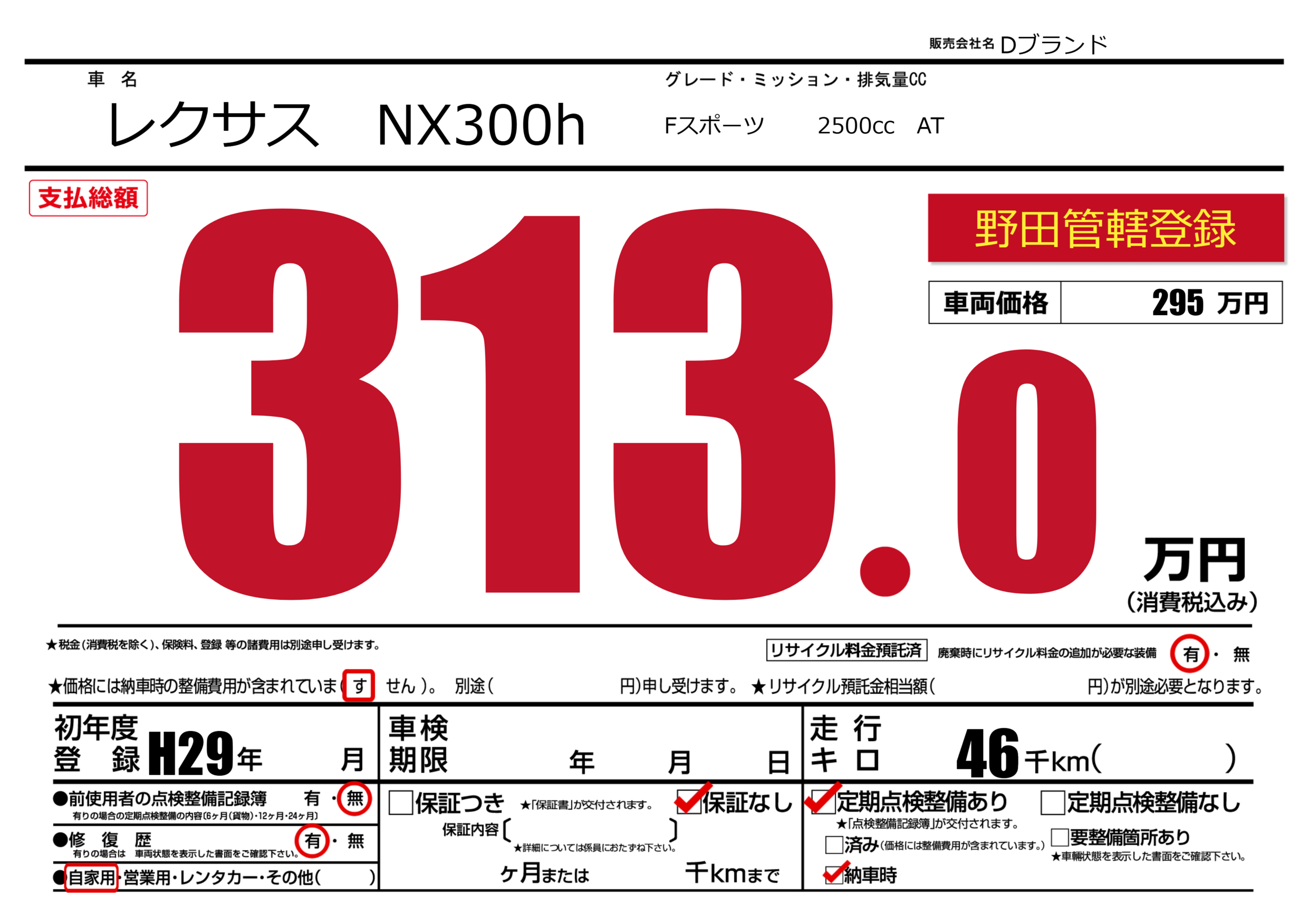 | 車名 | レクサス NX300h | グレード ミッション 排気量 |