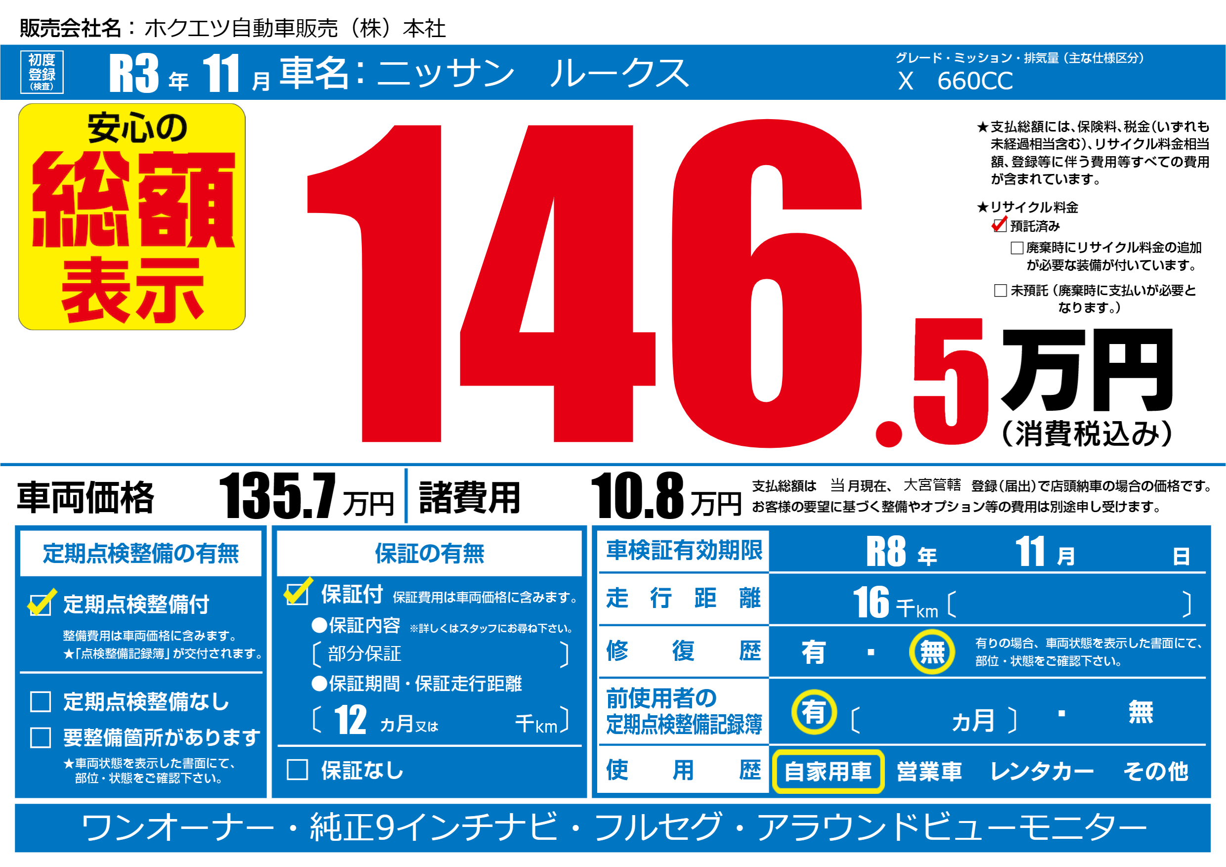 | 走行キロ | 1.6万km | 初年度登録 | R3年11月 |