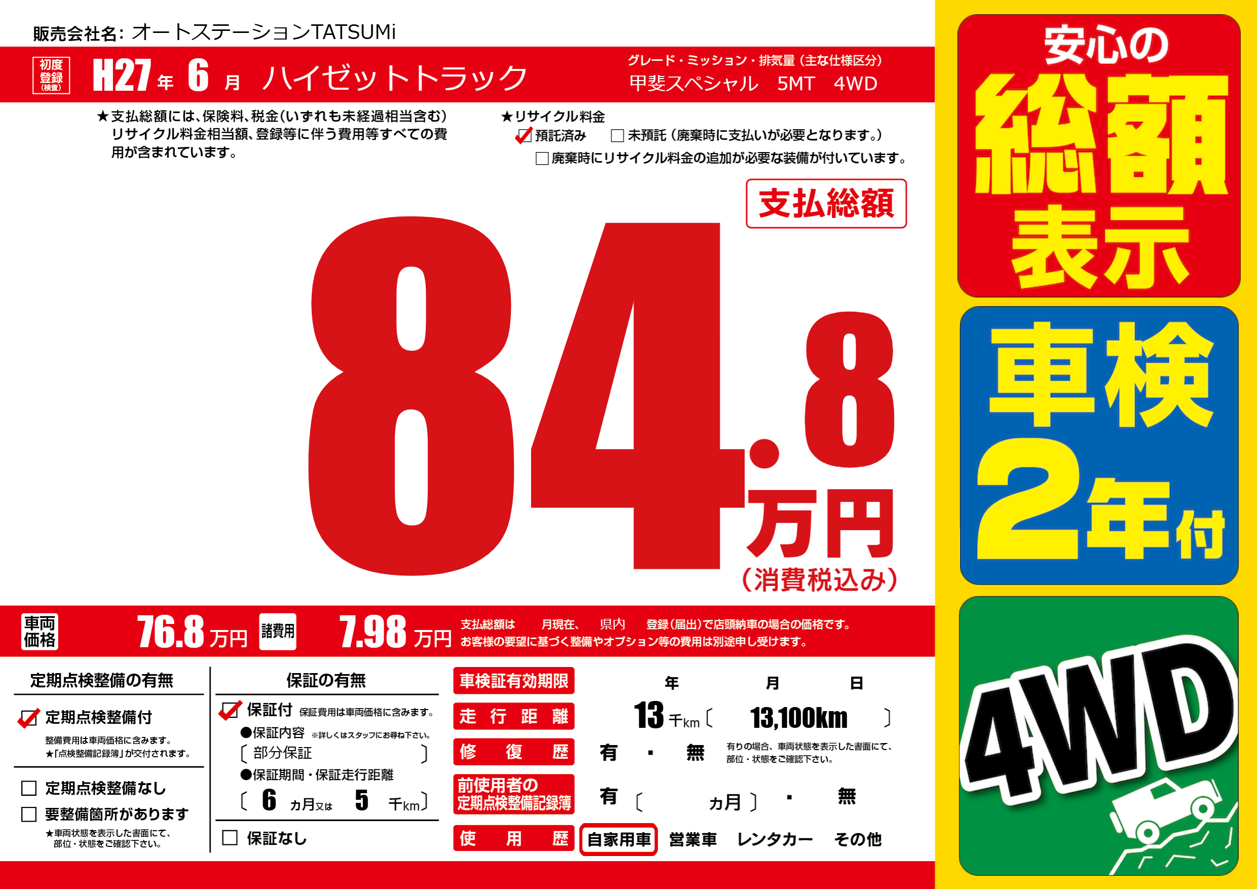 | 走行キロ | 1.3万km | 初年度登録 | H27年6月 |
