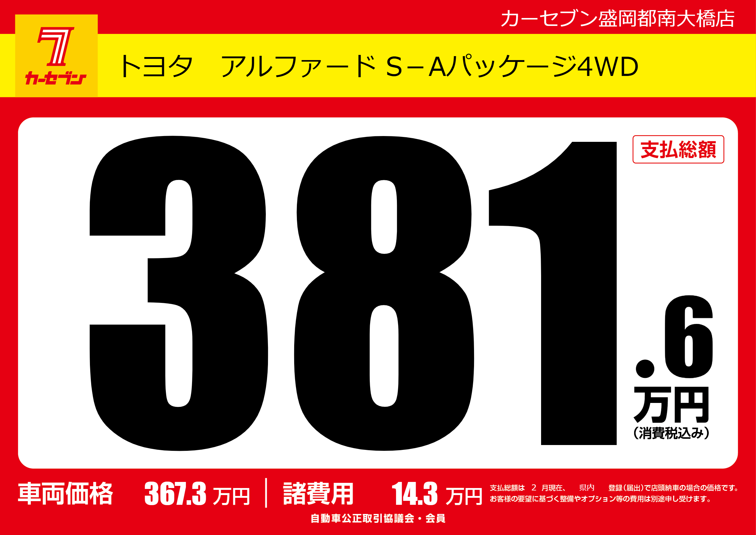 | 車名 | トヨタ アルファード S-Aパッケージ4WD | グレード ミッション 排気量 |