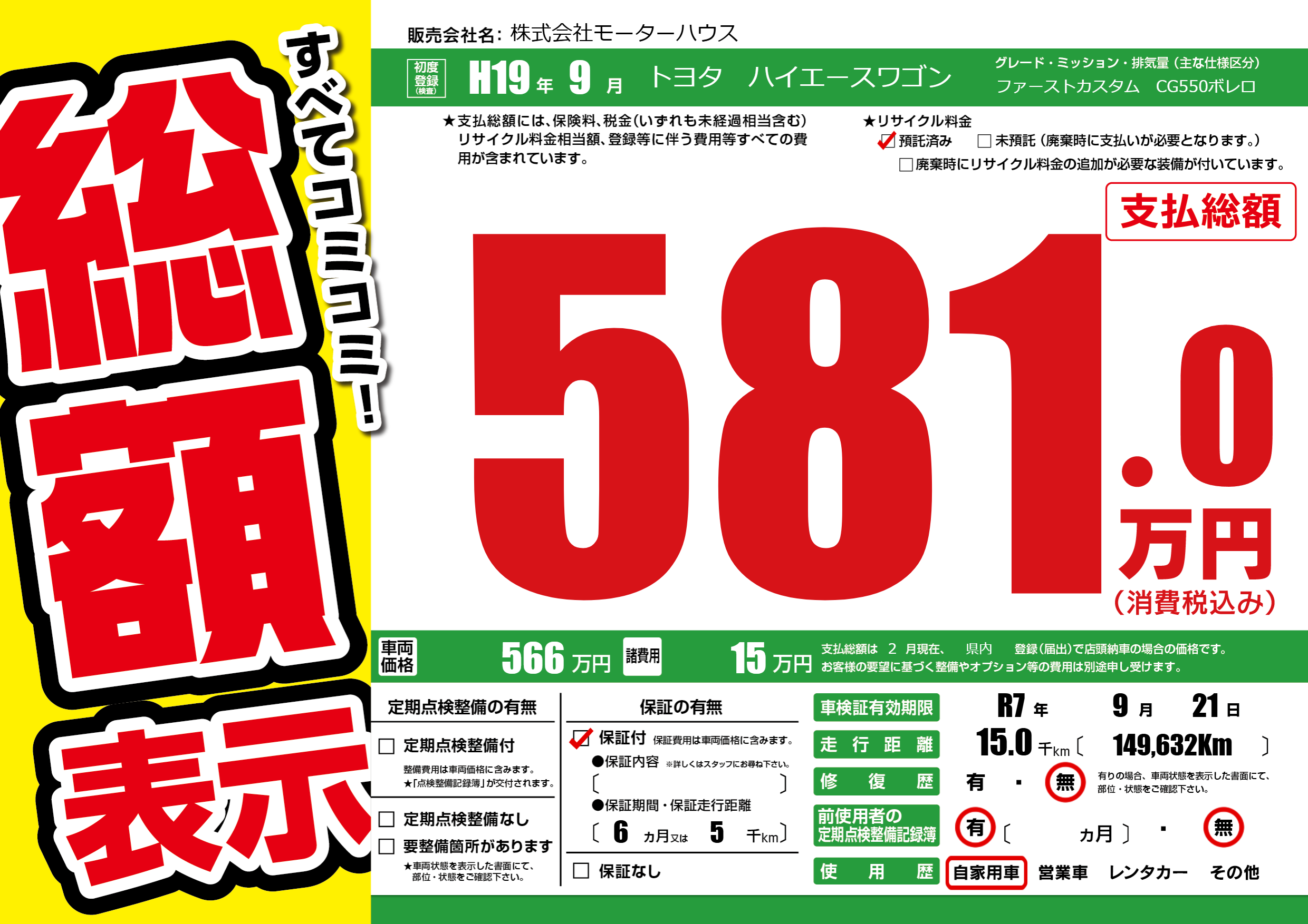 | 車名 | トヨタ ハイエースワゴン | グレード ミッション 排気量 |