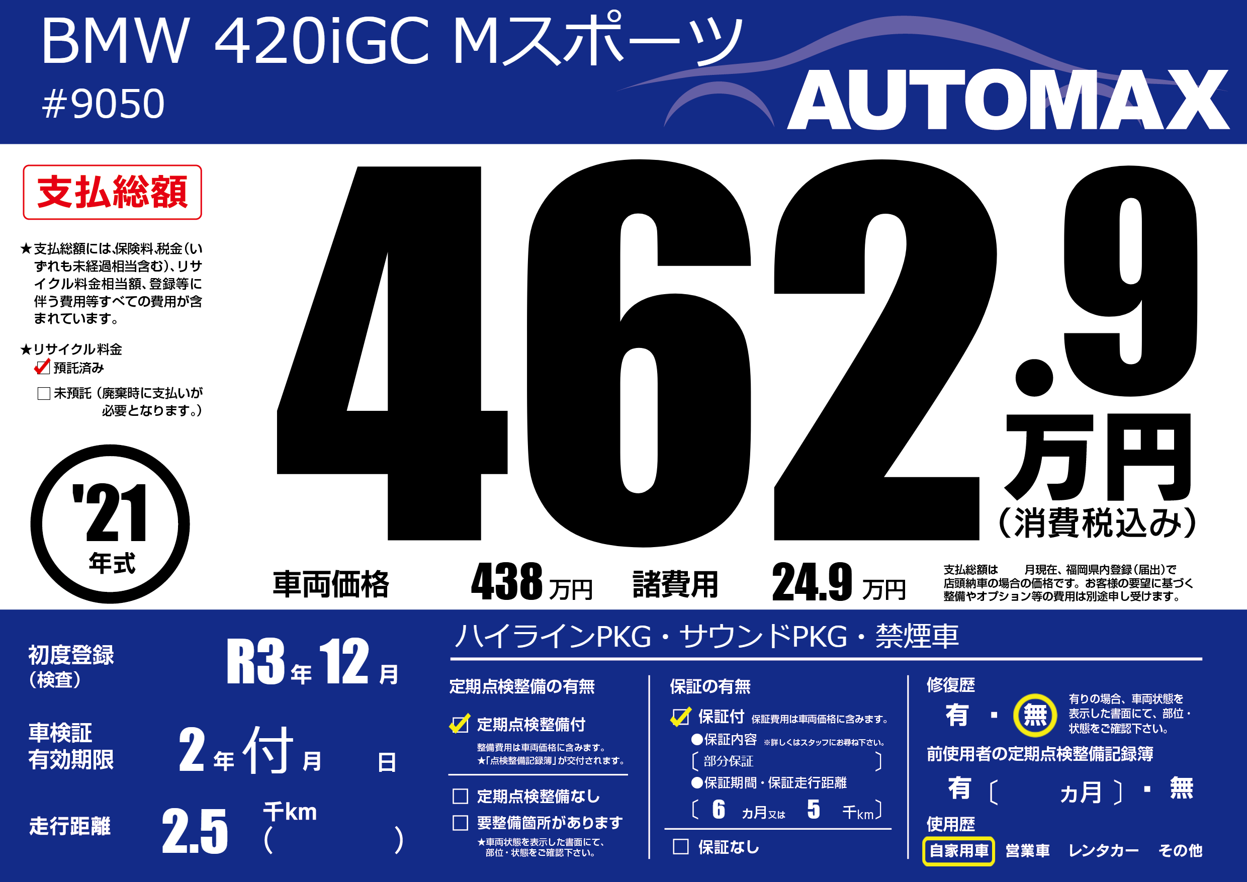 | 車名 | BMW 420iGC Mスポーツ | グレード ミッション 排気量 |