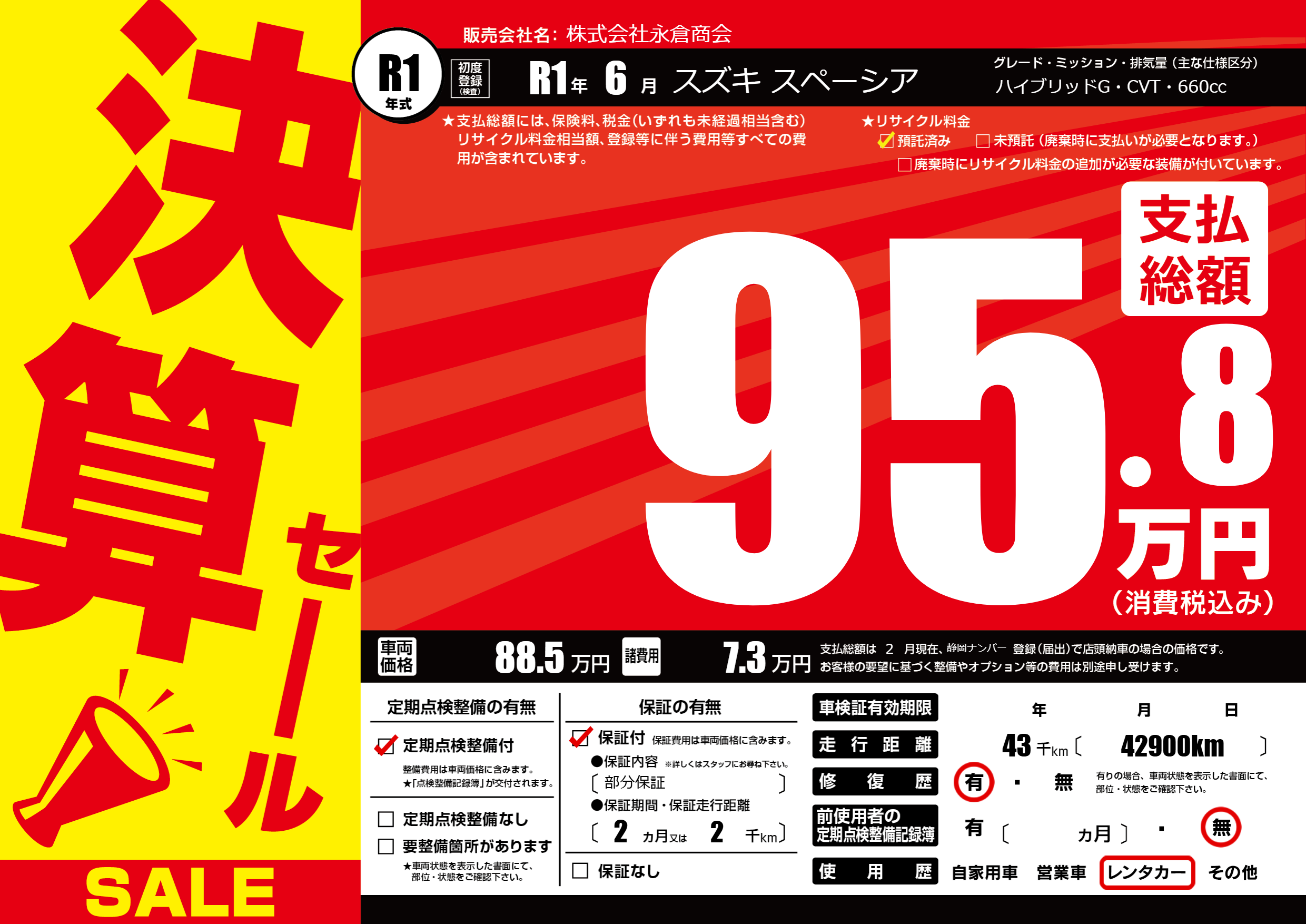 | 走行キロ | 4.3万km | 初年度登録 | R1年6月 |