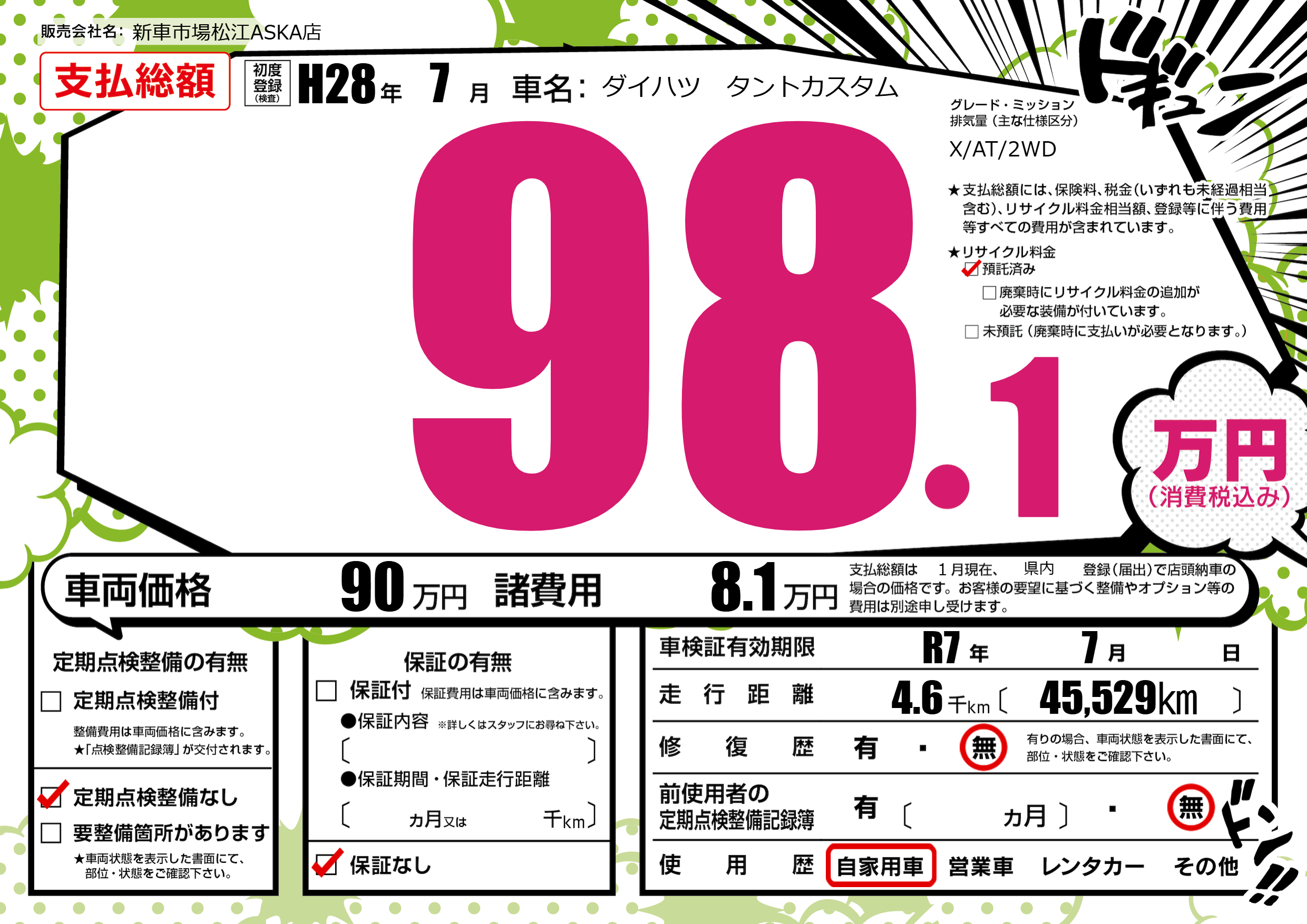 | 車名 | ダイハツ タントカスタム | グレード ミッション 排気量 |