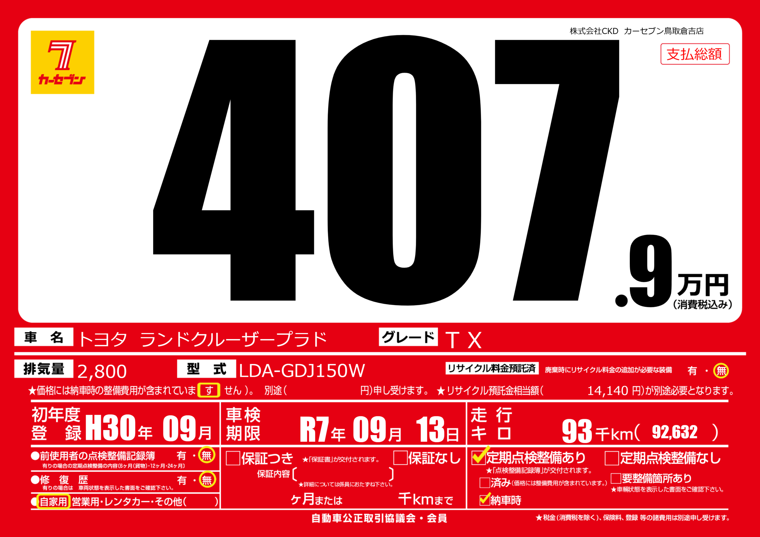 | 車名 | トヨタ ランドクルーザープラド | グレード ミッション 排気量 |