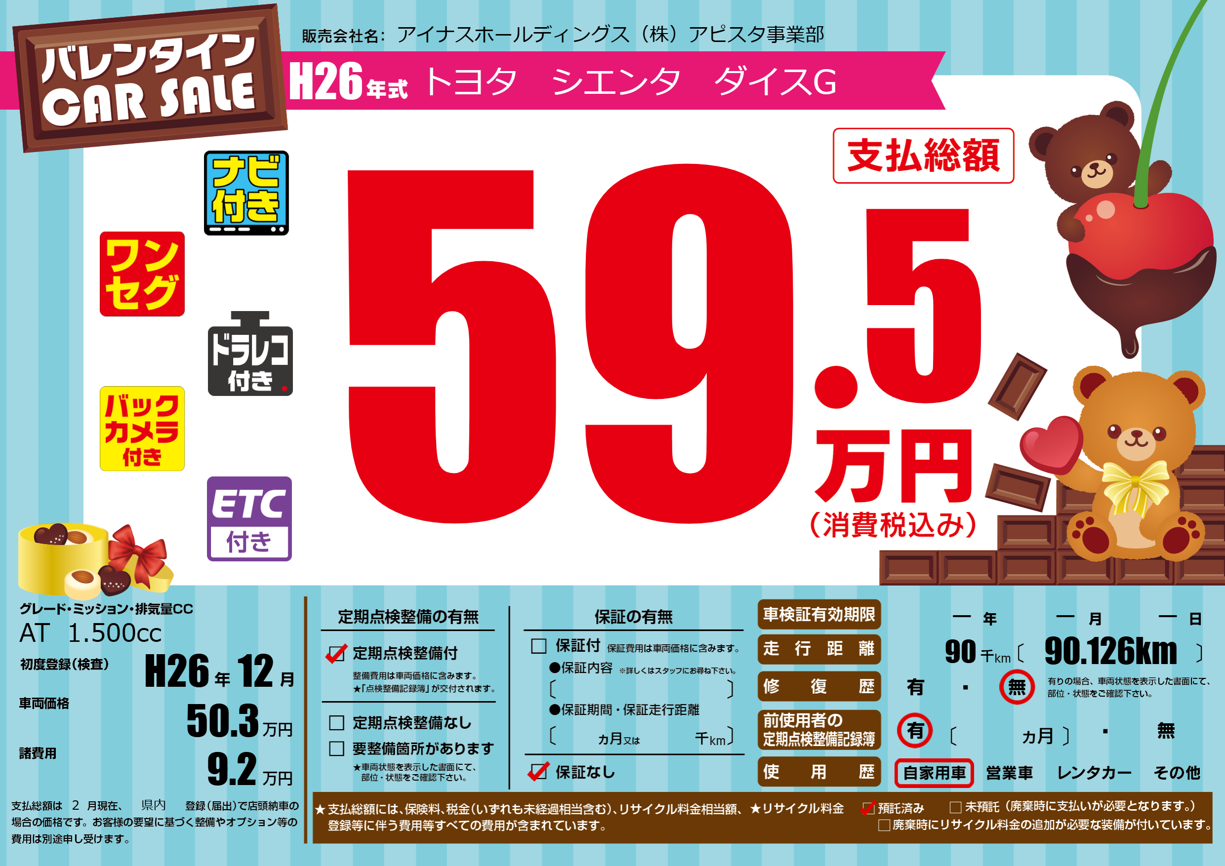 | 車名 | トヨタ シエンタ ダイスG | グレード ミッション 排気量 |