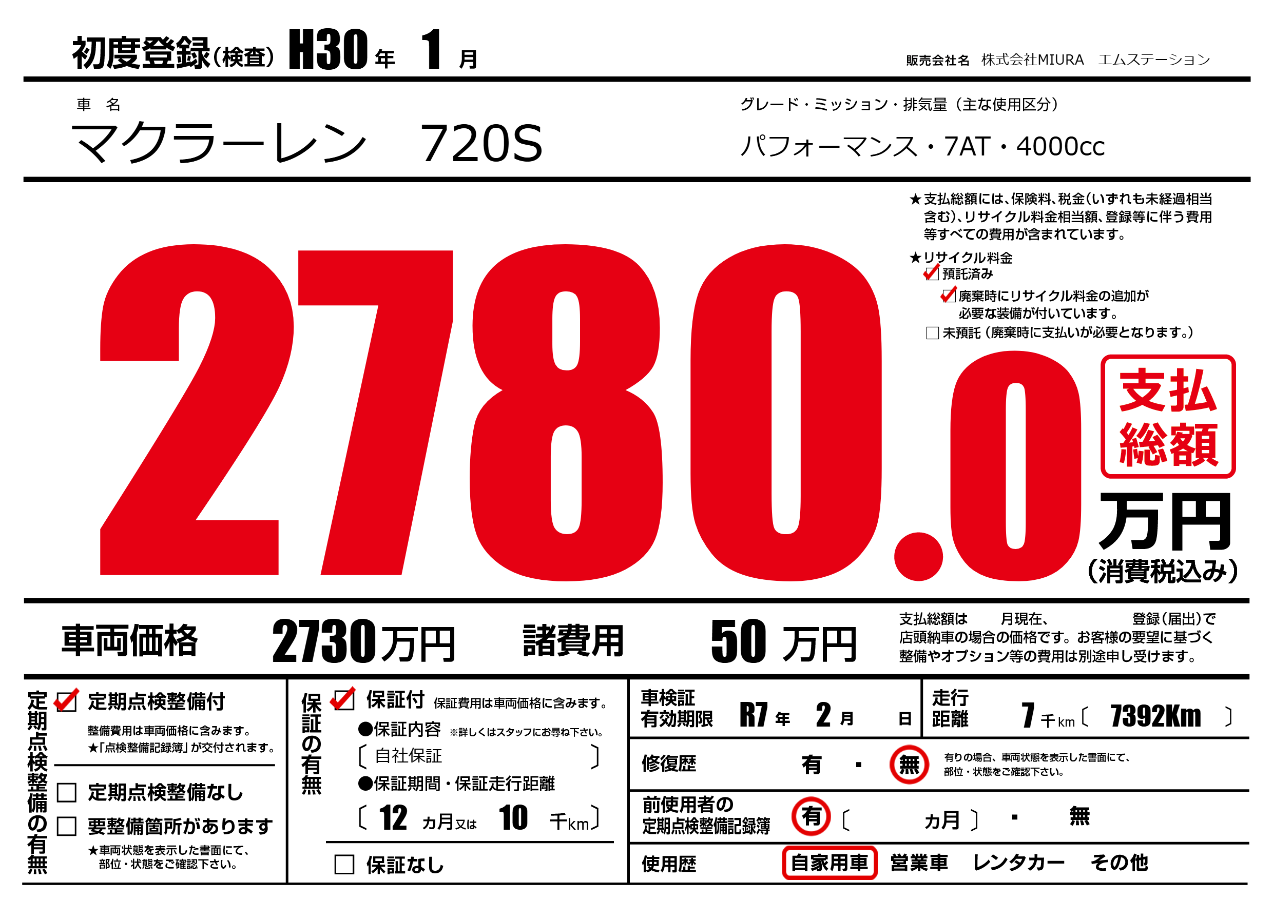 | 車名 | マクラーレン 720S | グレード ミッション 排気量 |